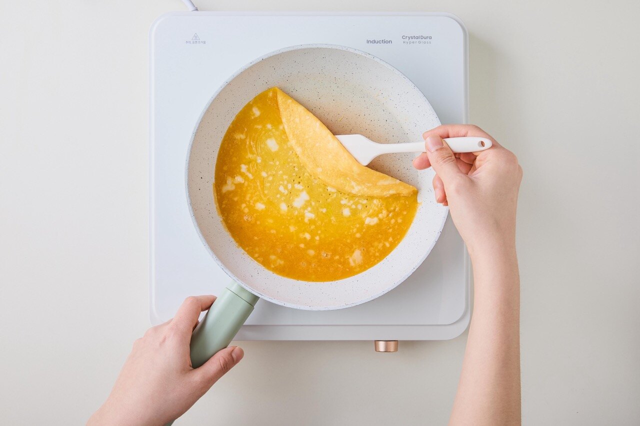 소금을 넣고 풀어둔 달걀로 얇게 지단을 부쳐주세요.
