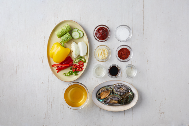 넓은 그릇에 손질한 전복과 채소를 보기 좋게 담고,