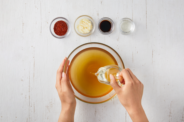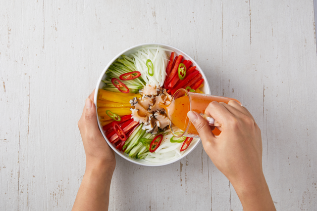 냉면 육수에 양념장 재료를 모두 넣고 섞어주세요.
