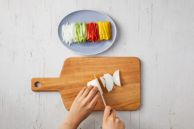 양파, 파프리카, 오이는 얇게 채썰어 주세요.