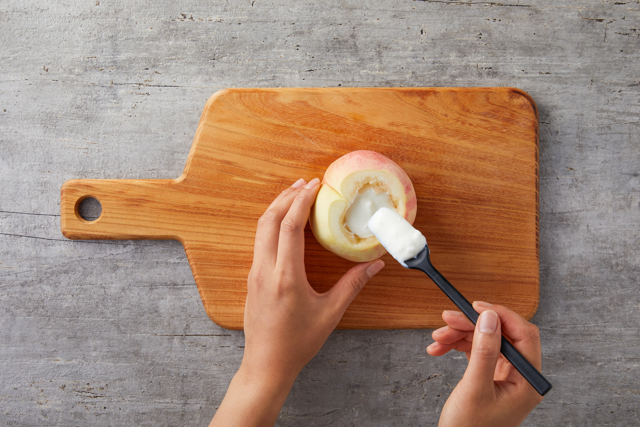 복숭아 속을 그릭요거트로 채워주고, 잘라두었던 윗부분을 뚜껑처럼 덮어 1시간 동안 냉장 보관해 주세요