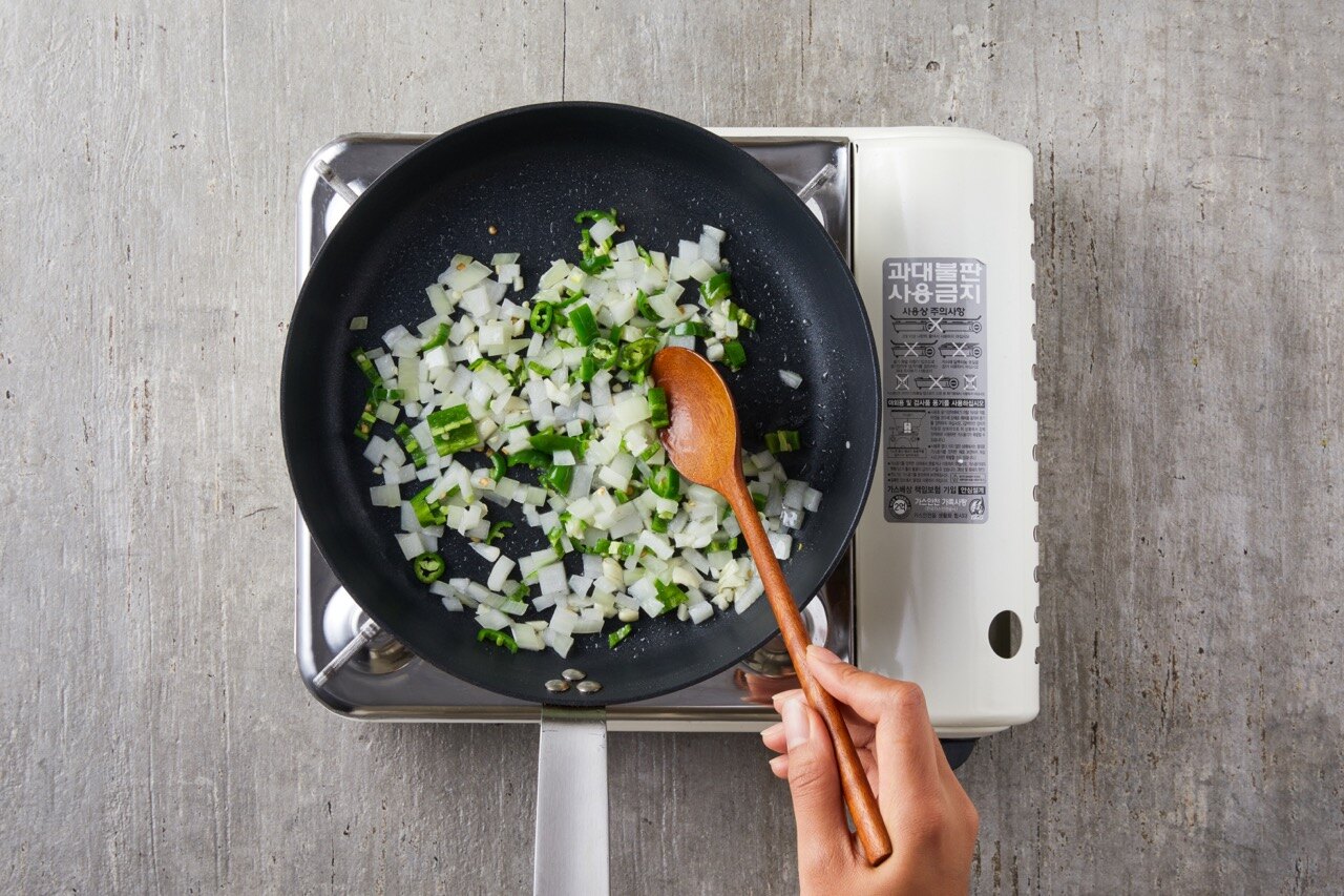 손질한 양파와 청양고추를 넣어 볶아주세요.