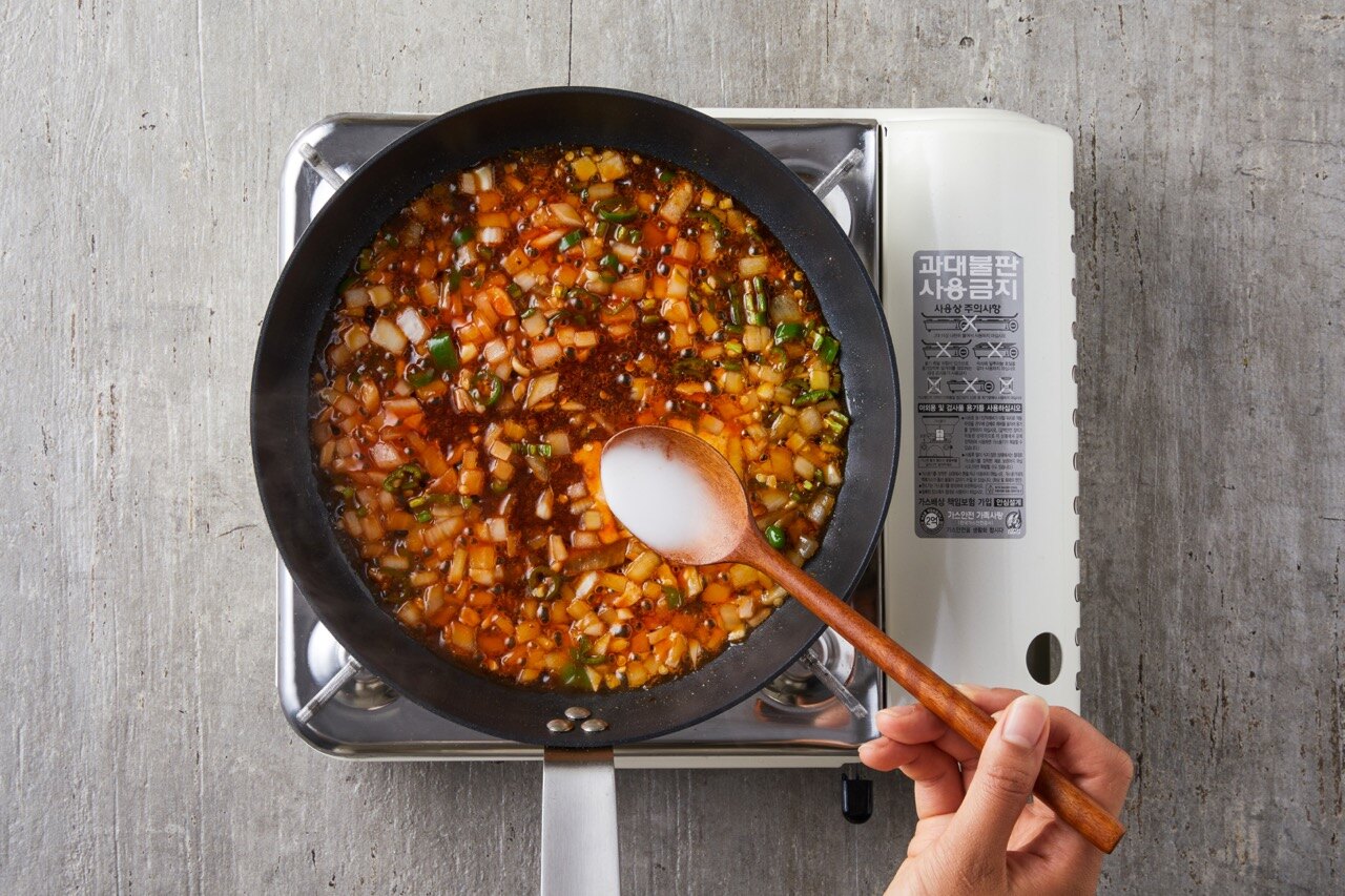 전분물 (전분1:물1) 2큰술을 넣어 점성이 생기도록 졸여주세요.