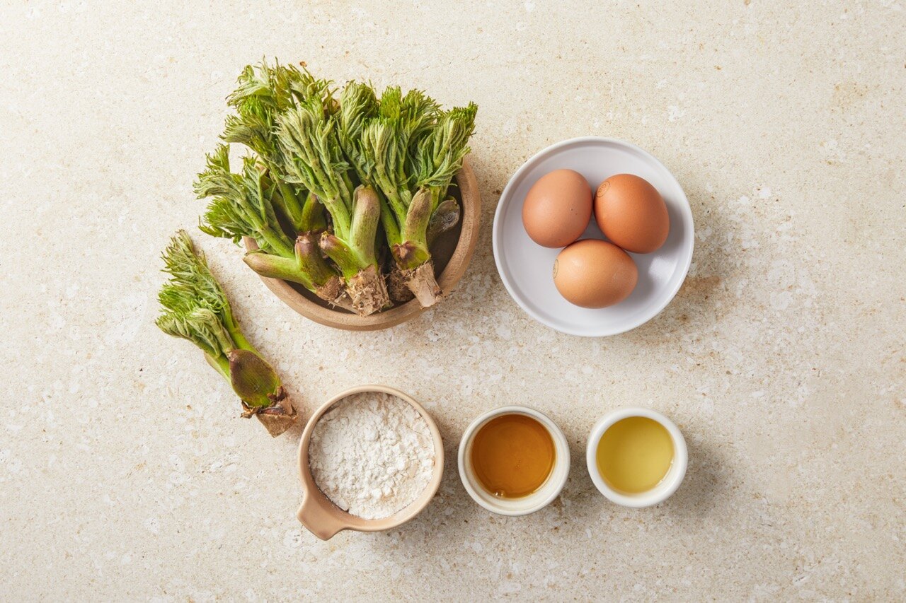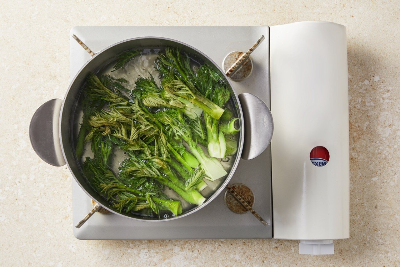 달군 팬에 손질한 두릅을 넣고 소주 3큰술과 소금 2꼬집을 넣어 1분간 볶아주세요.
