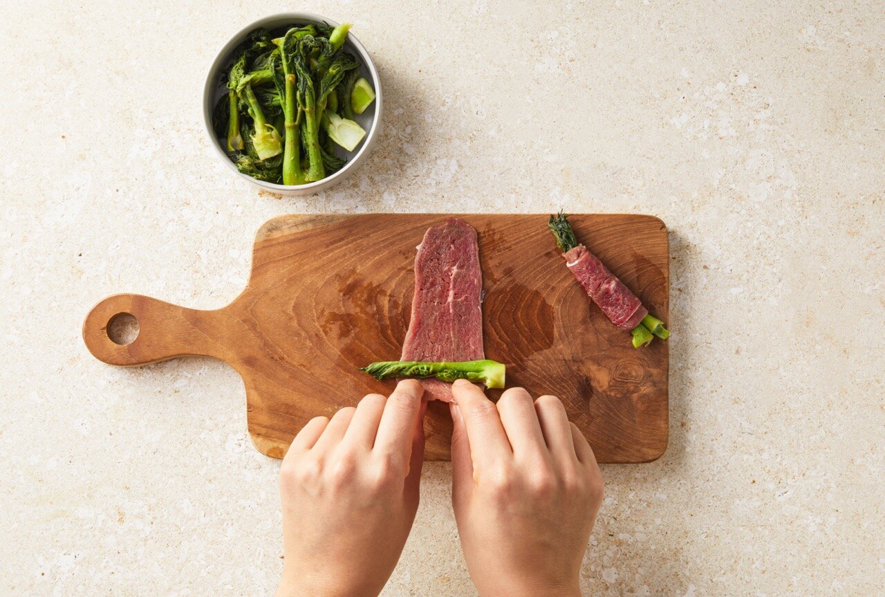 밑간을 한 고기에 볶아놓은 두릅을 넣고 돌돌 말아주세요.