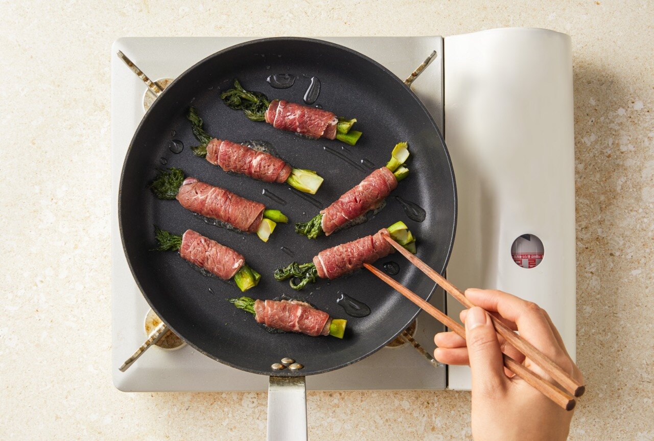 돌돌 만 고기가 맞닿는 부분을 팬의 바닥에 가도록 올린 뒤 누르듯 굴려가며 1~2분간 구워주세요.