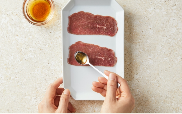 도마 위에 고기를 잘 펴고 생강즙 1큰술과 물 1큰술, 후추를 섞어 발라주세요.