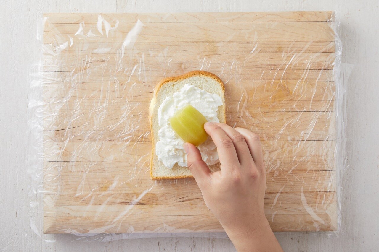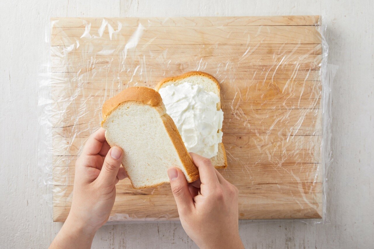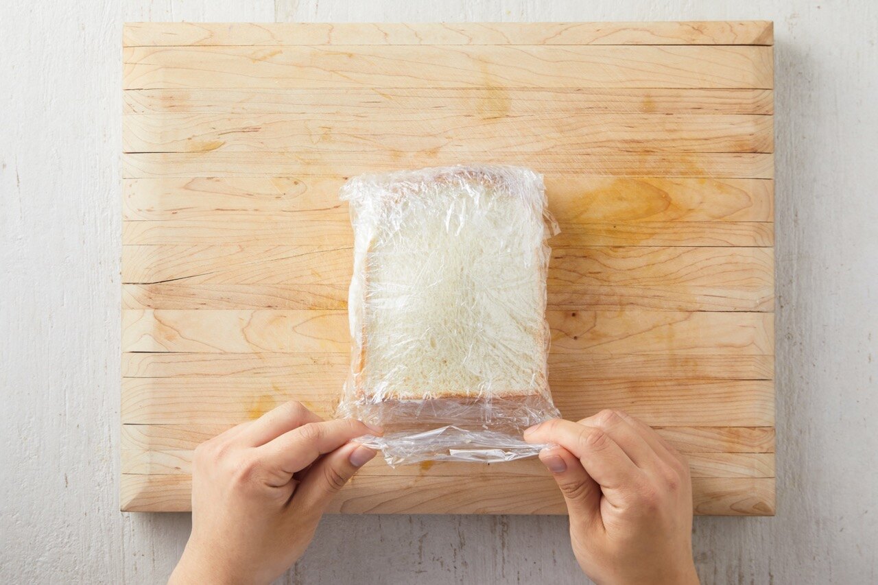도마에 랩을 넓게 펼처서 깔고 식빵을 올린 뒤,
