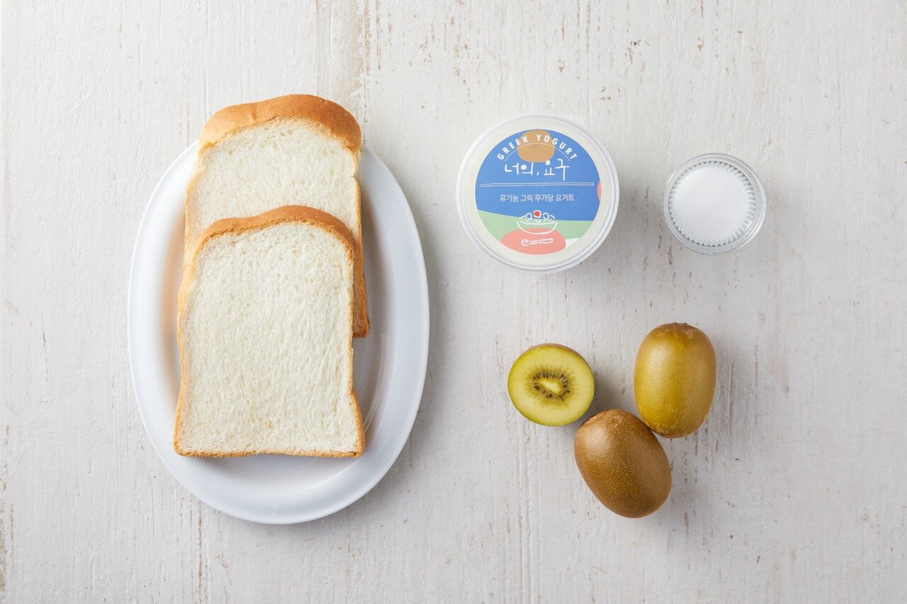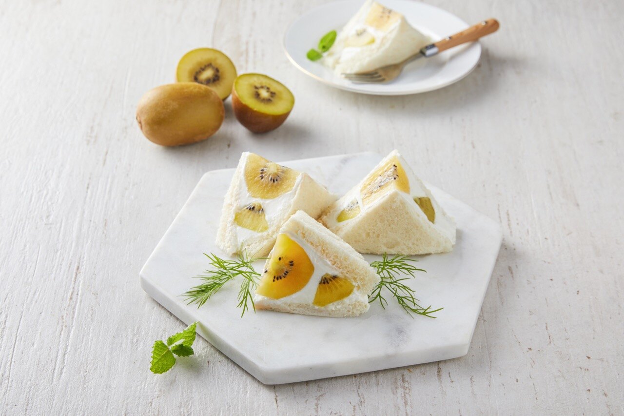 골드키위가 통째로 들어가 비주얼부터 남다른 샌드위치를 소개할게요. 부드러운 우유 식빵과 꾸덕한 그릭 요거트에 달콤한 골드키위가 더해져 환상의 조합을 선보인답니다. 한 입 물면 키위 과즙이 팡 터지는 행복을 느껴보세요.