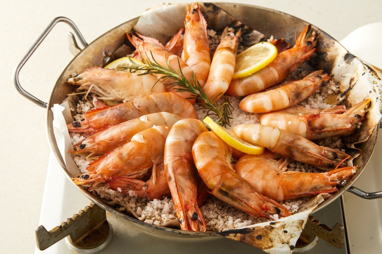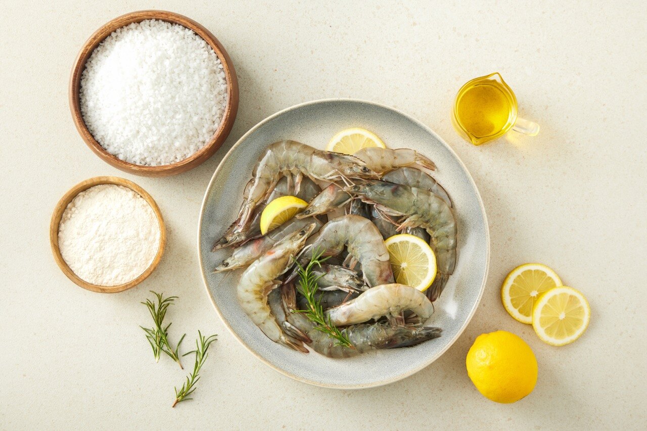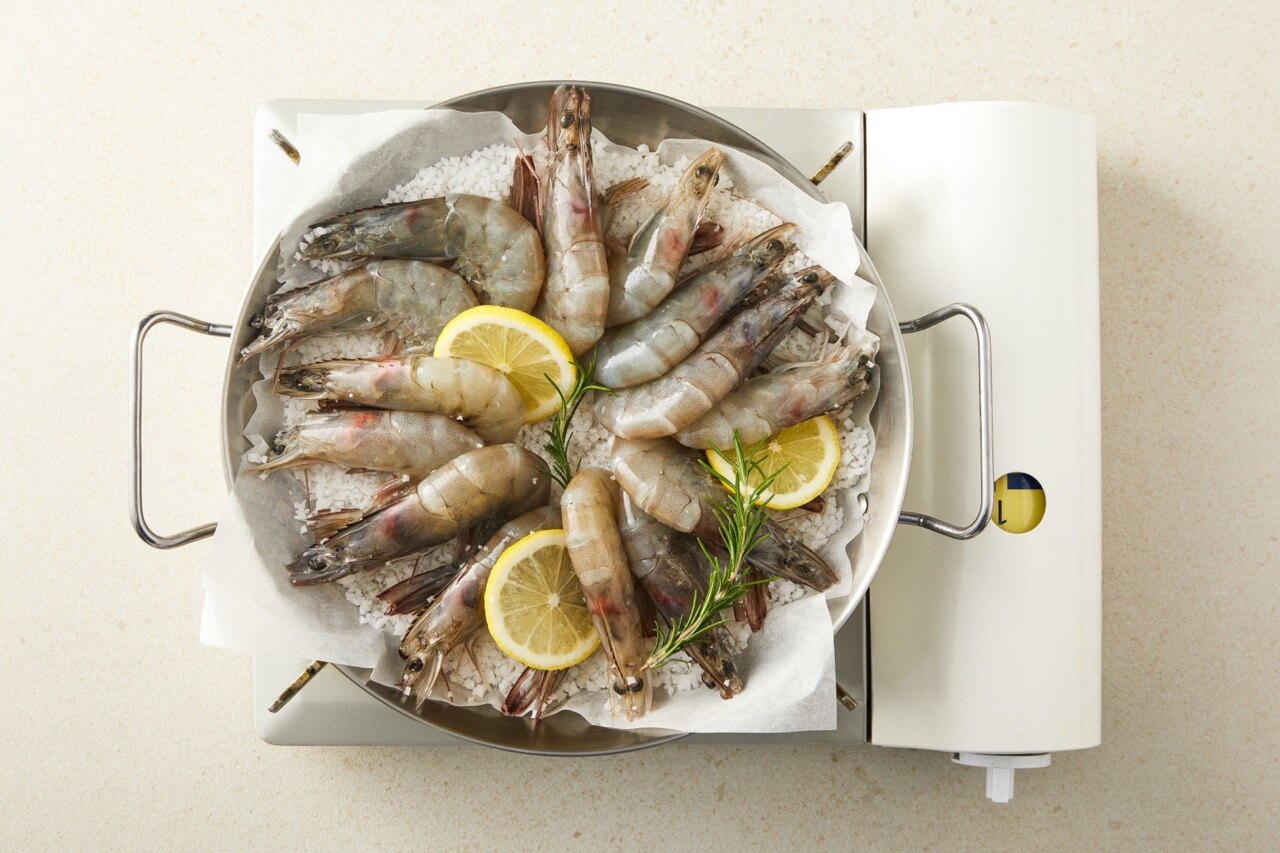 팬 위에 호일을 깔고 굵은 소금 400g을 골고루 펼쳐준 뒤 손질한 새우와 레몬, 로즈마리를 올려주세요.