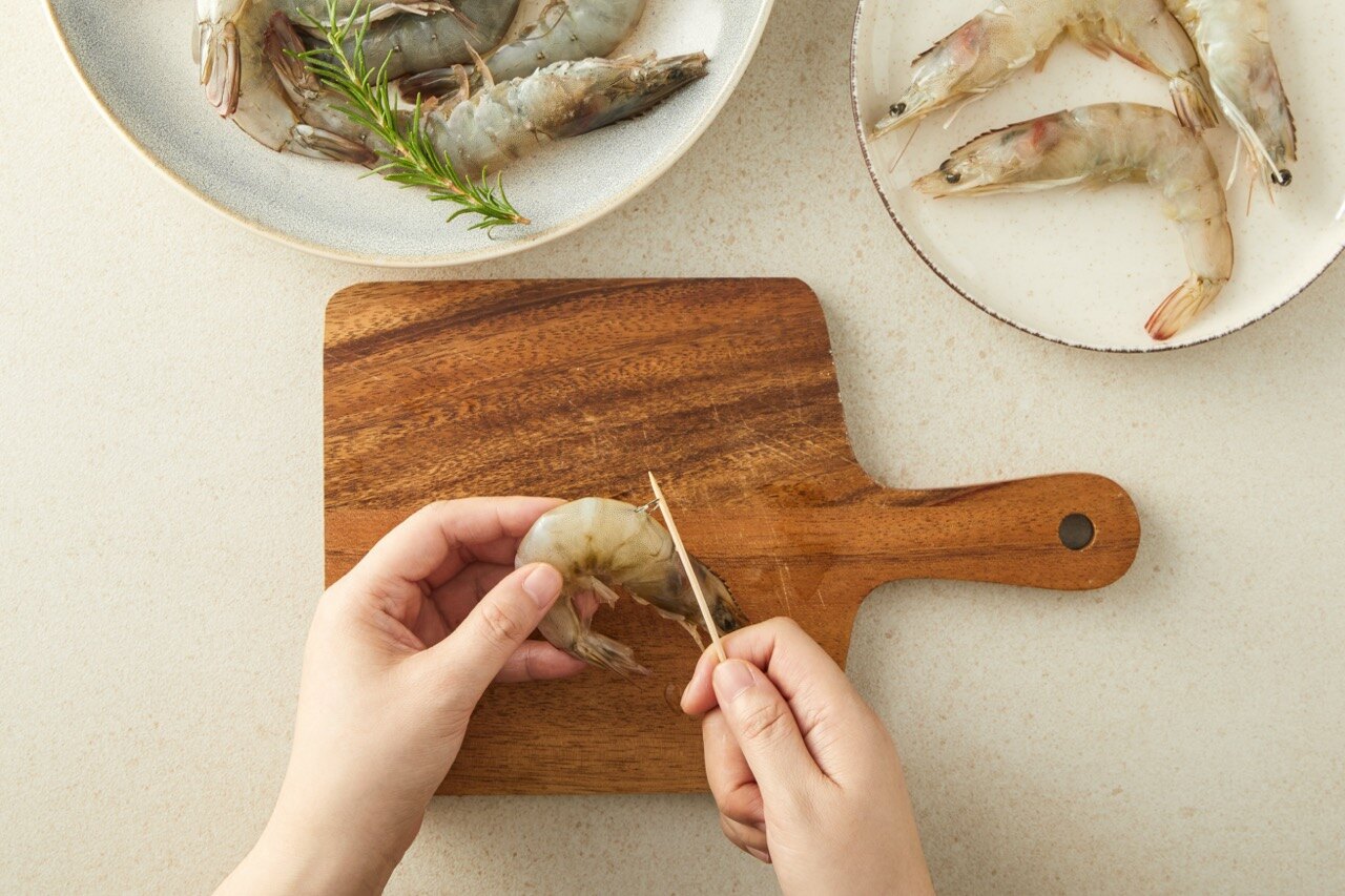 새우를 흐르는 물에 씻은 후 내장을 제거해 주세요.