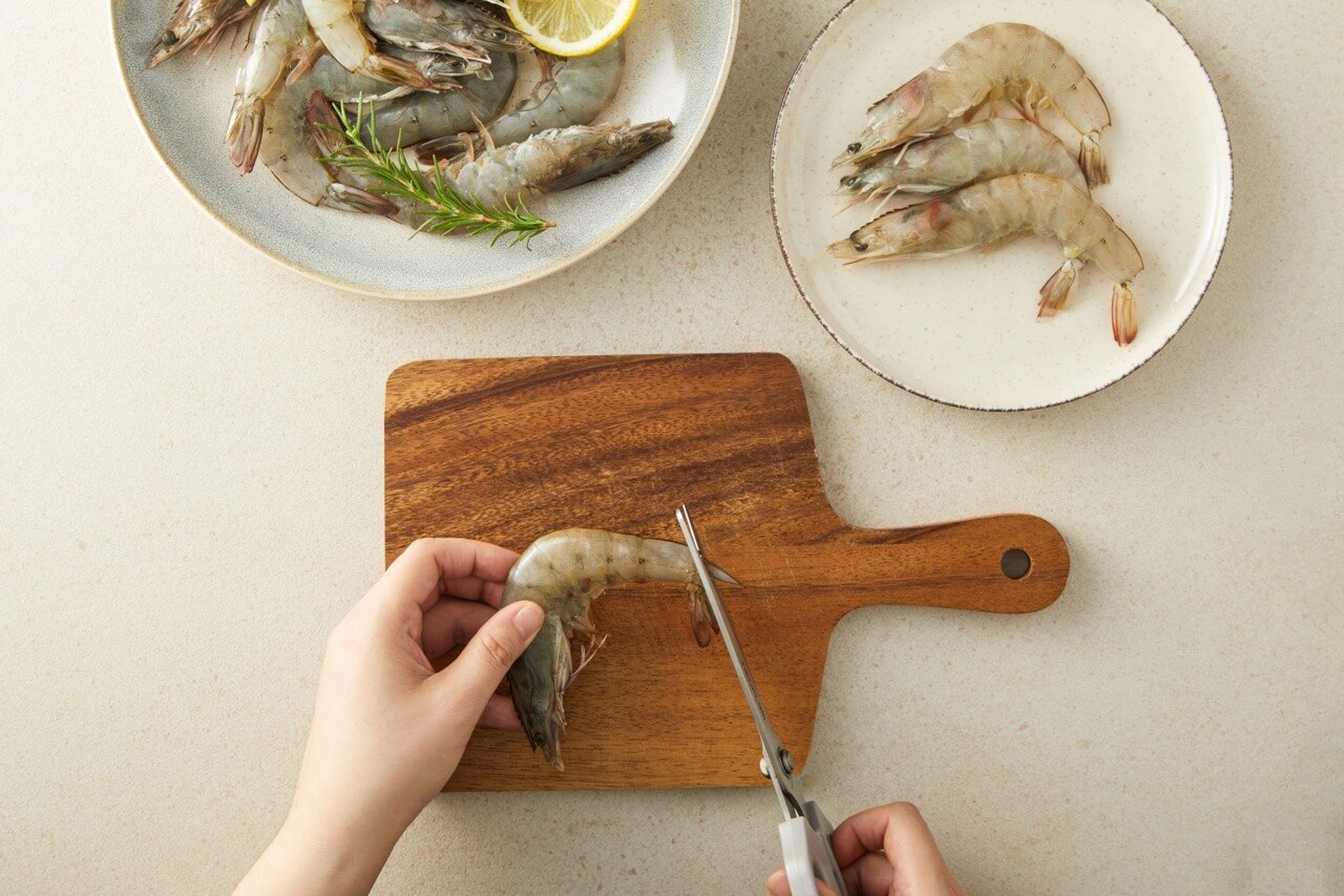 새우 꼬리 위쪽에 있는 물총을 가위로 잘라주세요.