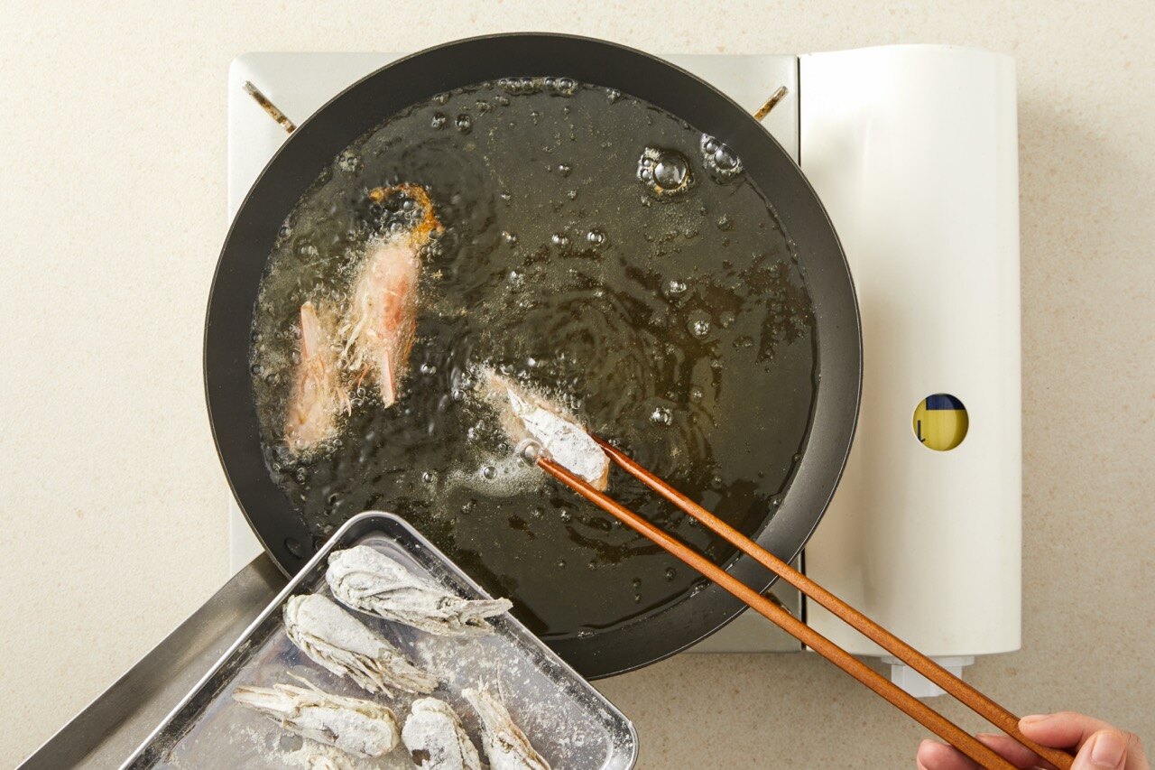 170도로 예열된 기름에 1분간 튀겨 주세요.