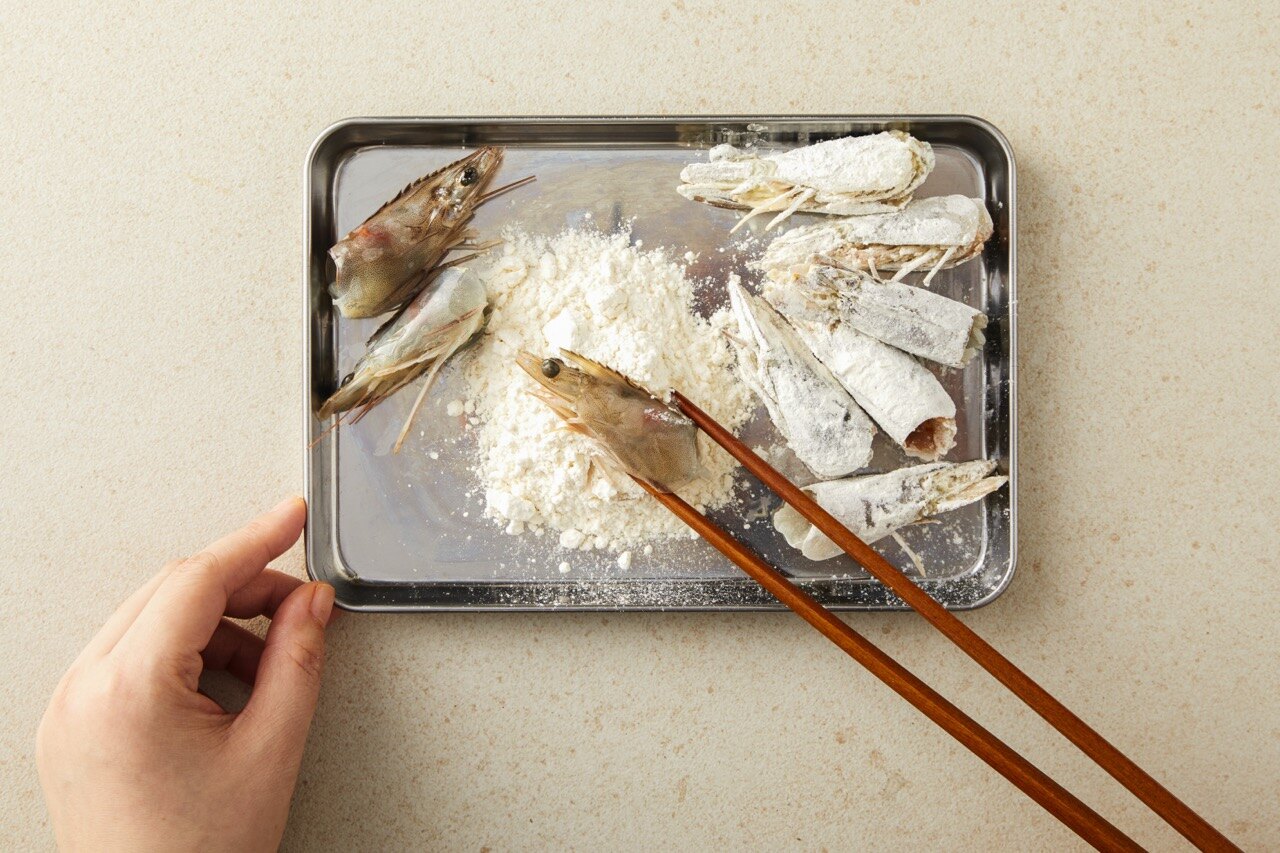 새우 머리는 따로 가위로 잘라 튀김가루를 얇게 묻혀주세요.