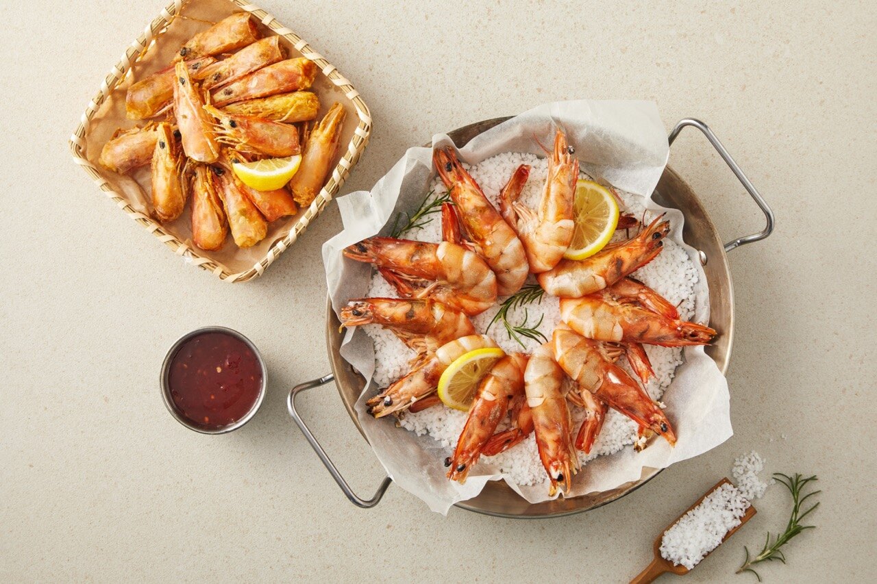 완성된 새우 소금구이와 새우 머리튀김은 칠리 소스나 스리라차 소스를 곁들여 드셔도 좋아요.