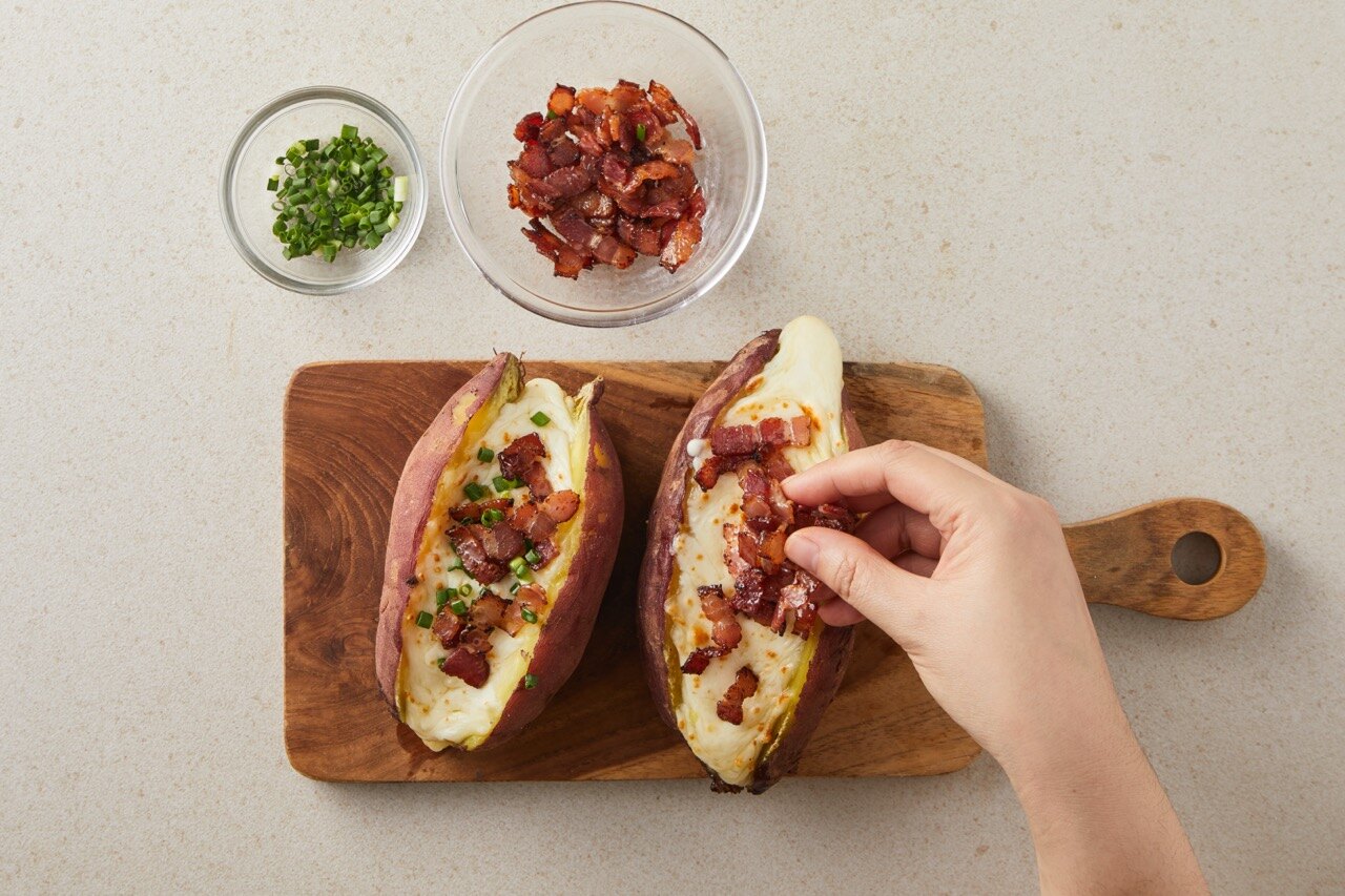 한 김 식힌 베이컨칩과 잘게 썬 쪽파를 올려 마무리해 주세요.