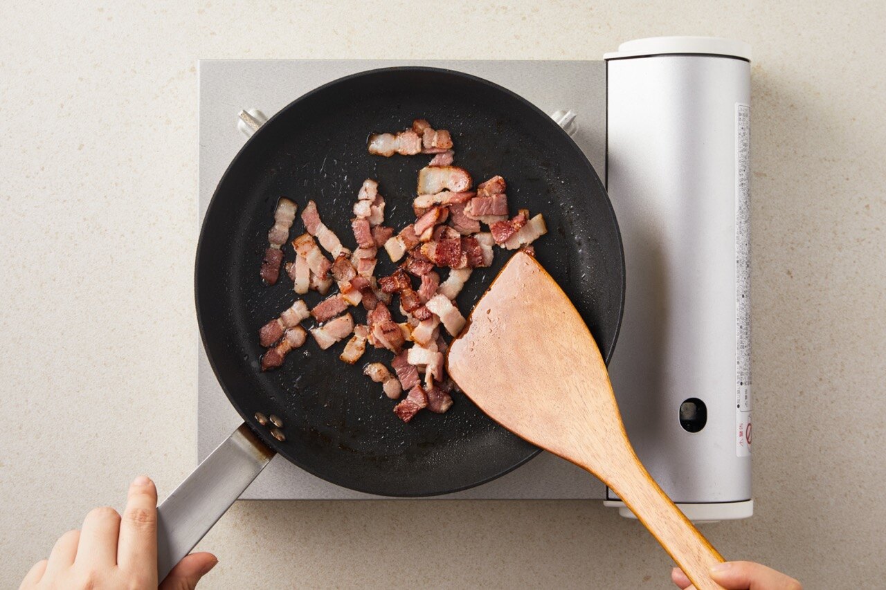 베이컨을 1cm 두께로 얇게 자르고, 겉면이 바삭해질 때까지 튀기듯이 구워주세요.