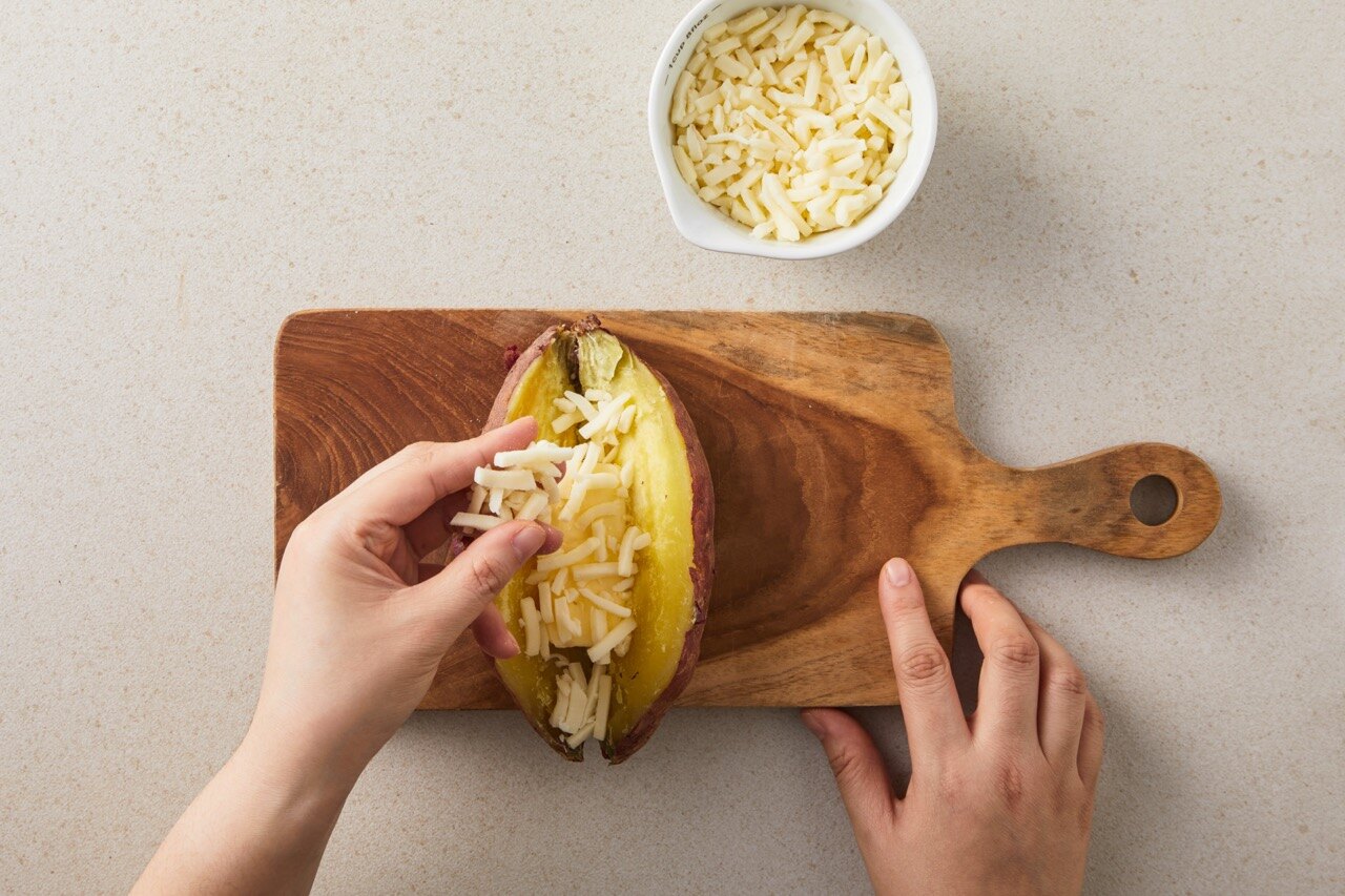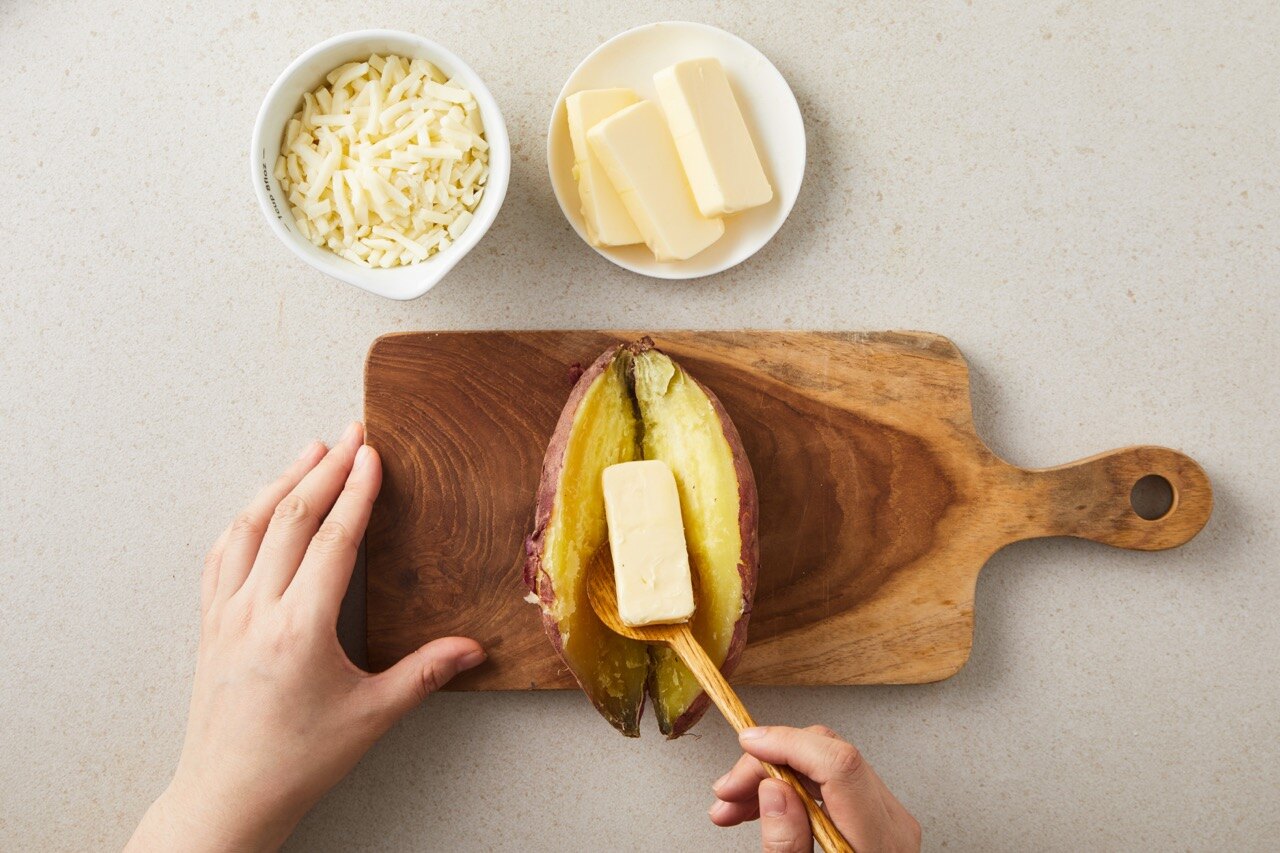 고구마는 180도 오븐에서 20분간 구워주고, 세로로 칼집을 낸 뒤 가운데 버터를 넣어주세요.