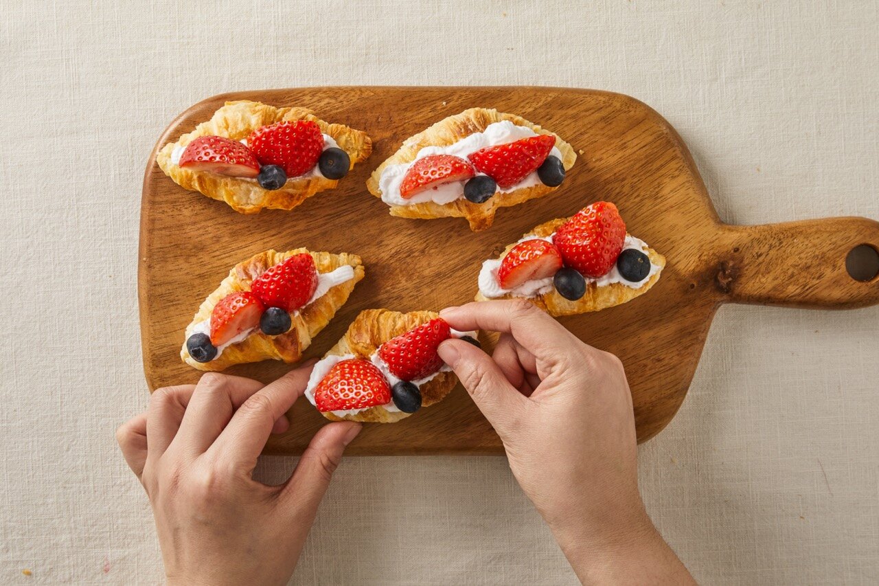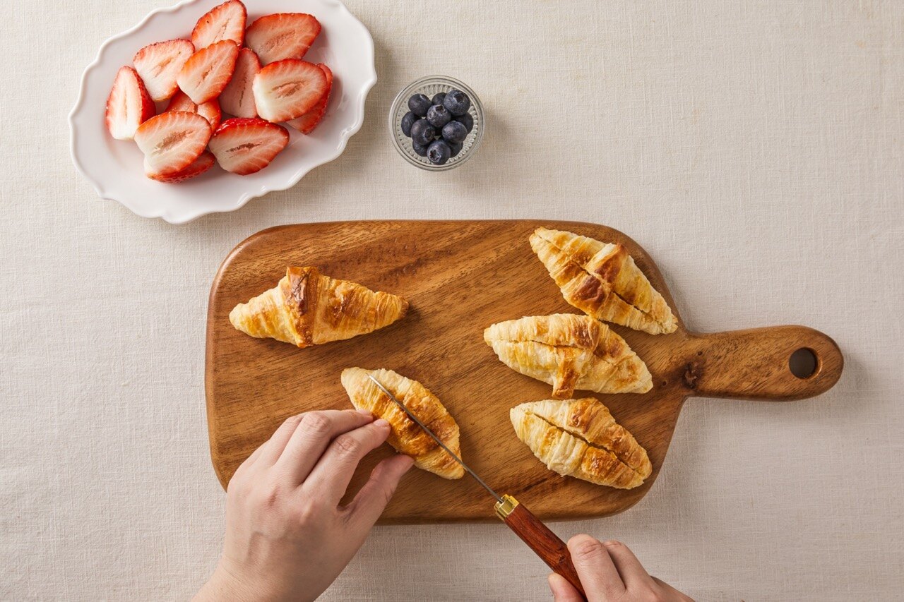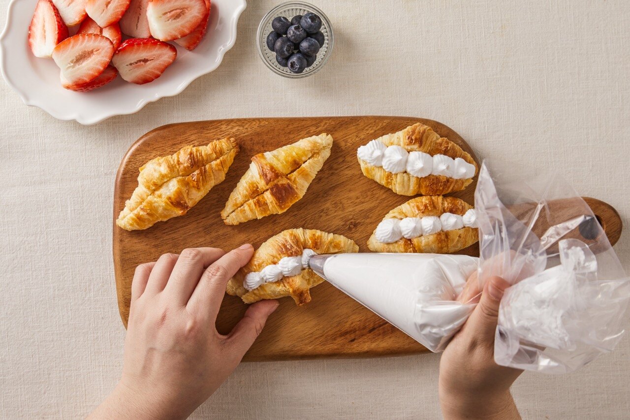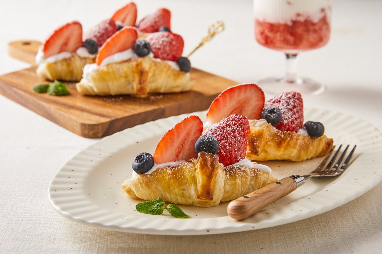 상큼한 딸기와 부드러운 생크림은 두말할 것 없이 최고의 조합이죠. 여기에 갓 구운 크로와상을 더한다면 그야말로 완벽한 디저트가 탄생해요. 눈과 입을 모두 사로잡는 딸기 생크림 크로와상, 앙증맞은 한 입 크기로 만들어 보세요.