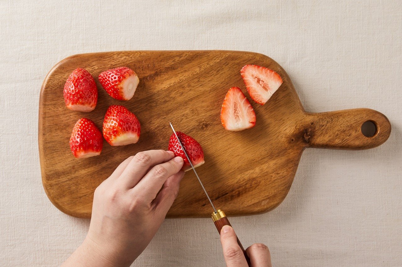 딸기는 꼭지 부분을 떼어낸 후 반으로 잘라주세요.