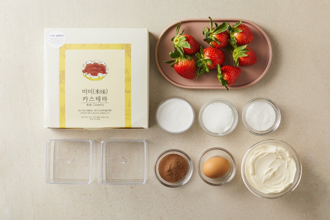투명한 용기에 카스테라와 딸기, 마스카포네 치즈 크림을