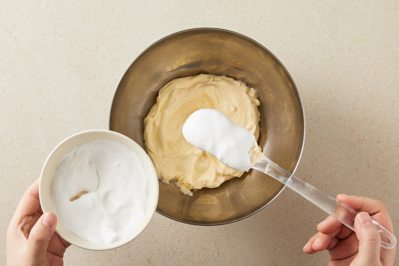 단단하게 휘핑한 생크림을 조금씩 나눠 넣으면서 부드러운 크림 형태가 될 때까지 섞어주세요.