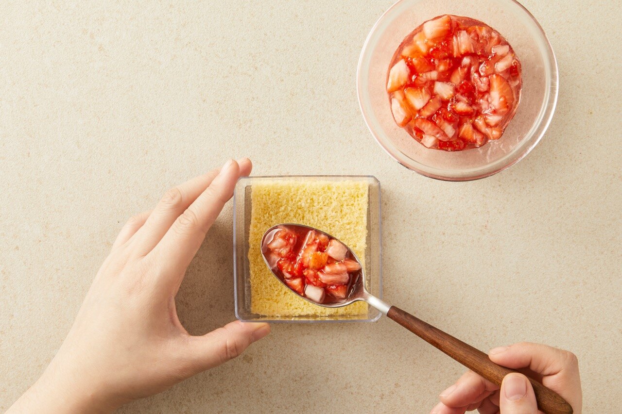 용기 크기에 맞춰 카스테라를 잘라 넣은 후 설탕에 절여둔 딸기를 1스푼 올려 골고루 펴주세요.