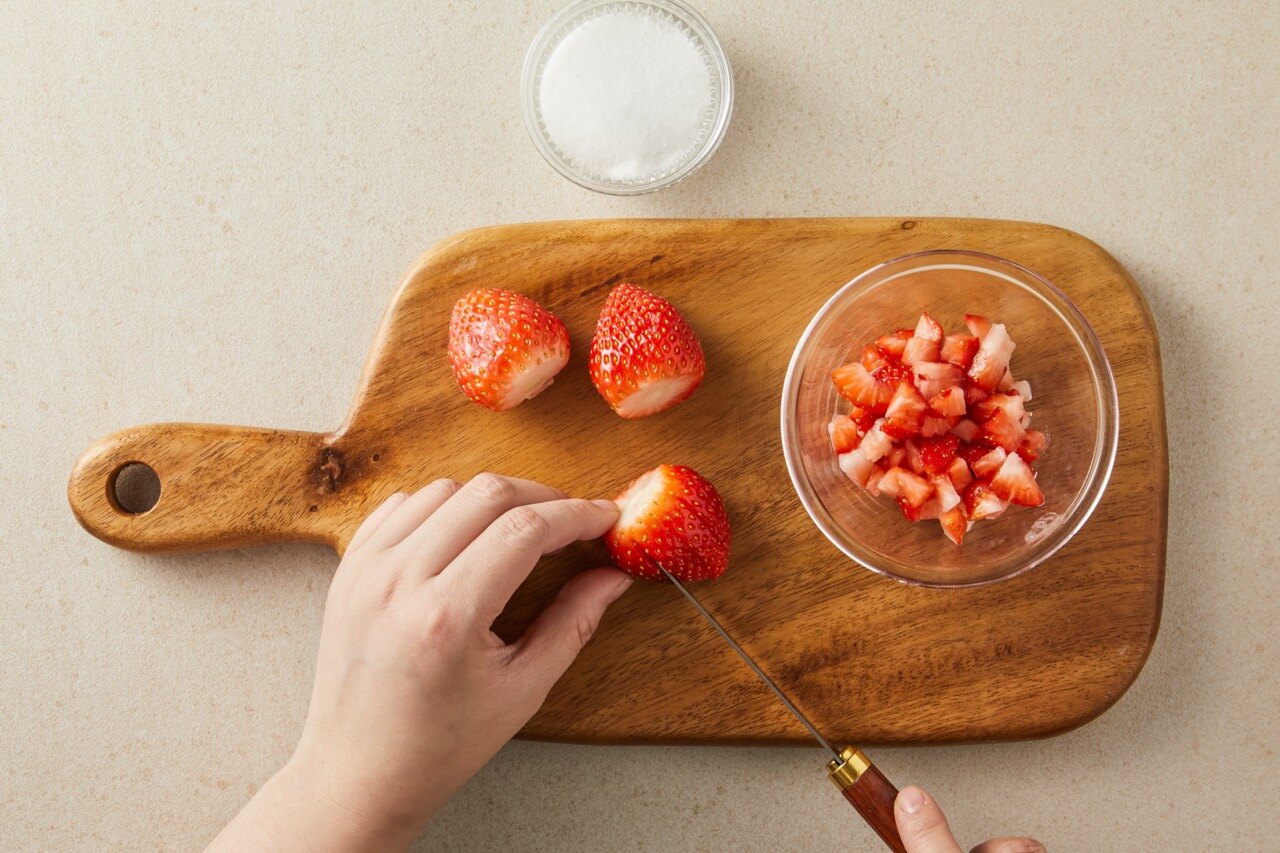 잘게 썬 딸기를 설탕 20g과 함께 버무려 절여주세요.