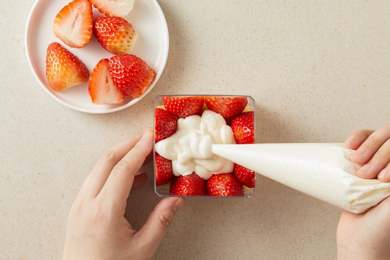 용기 벽면에 반으로 자른 딸기를 둘러주세요.