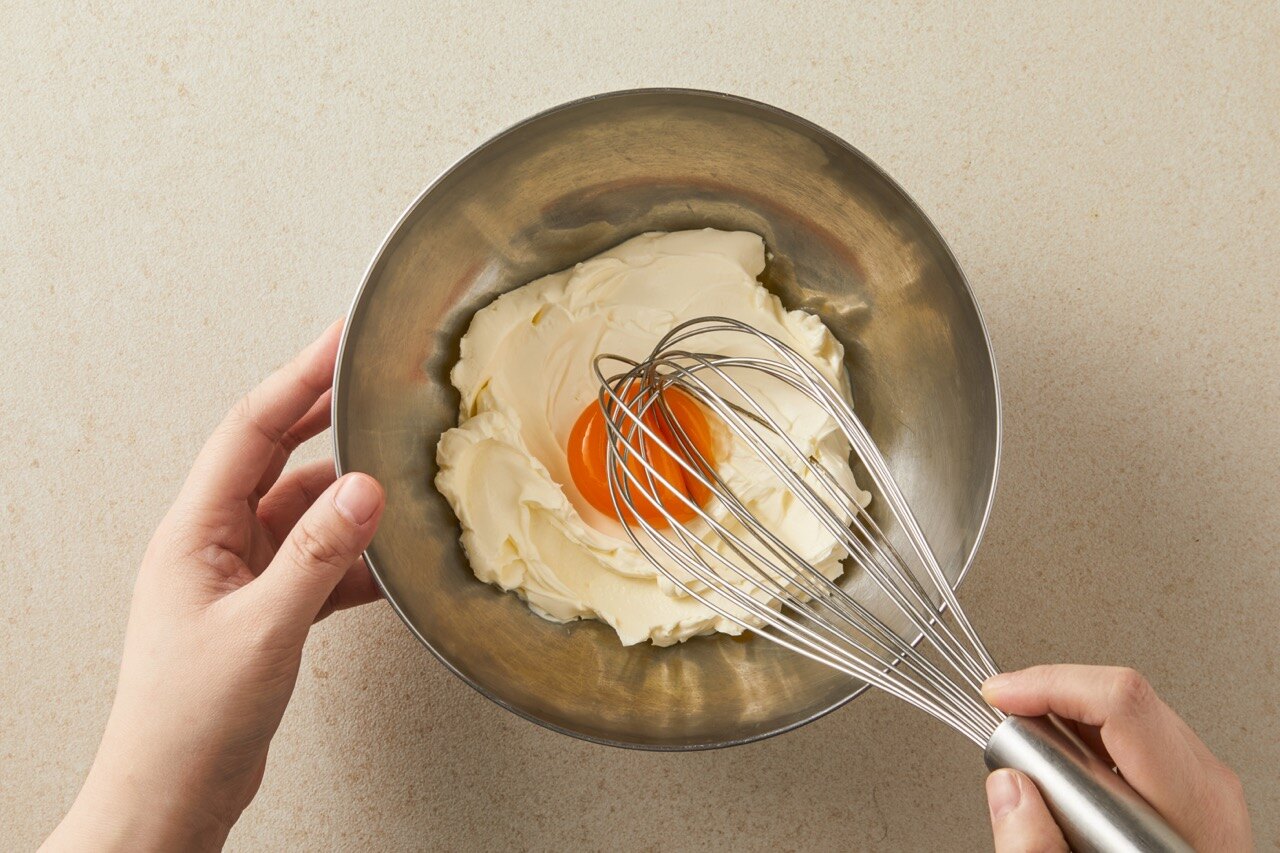 마스카포네 치즈 250g에 계란 노른자 1알을 넣고 골고루 섞어주세요.