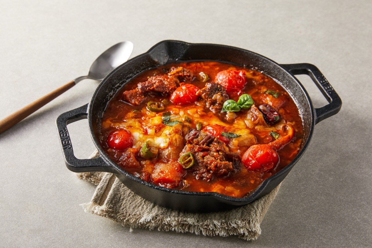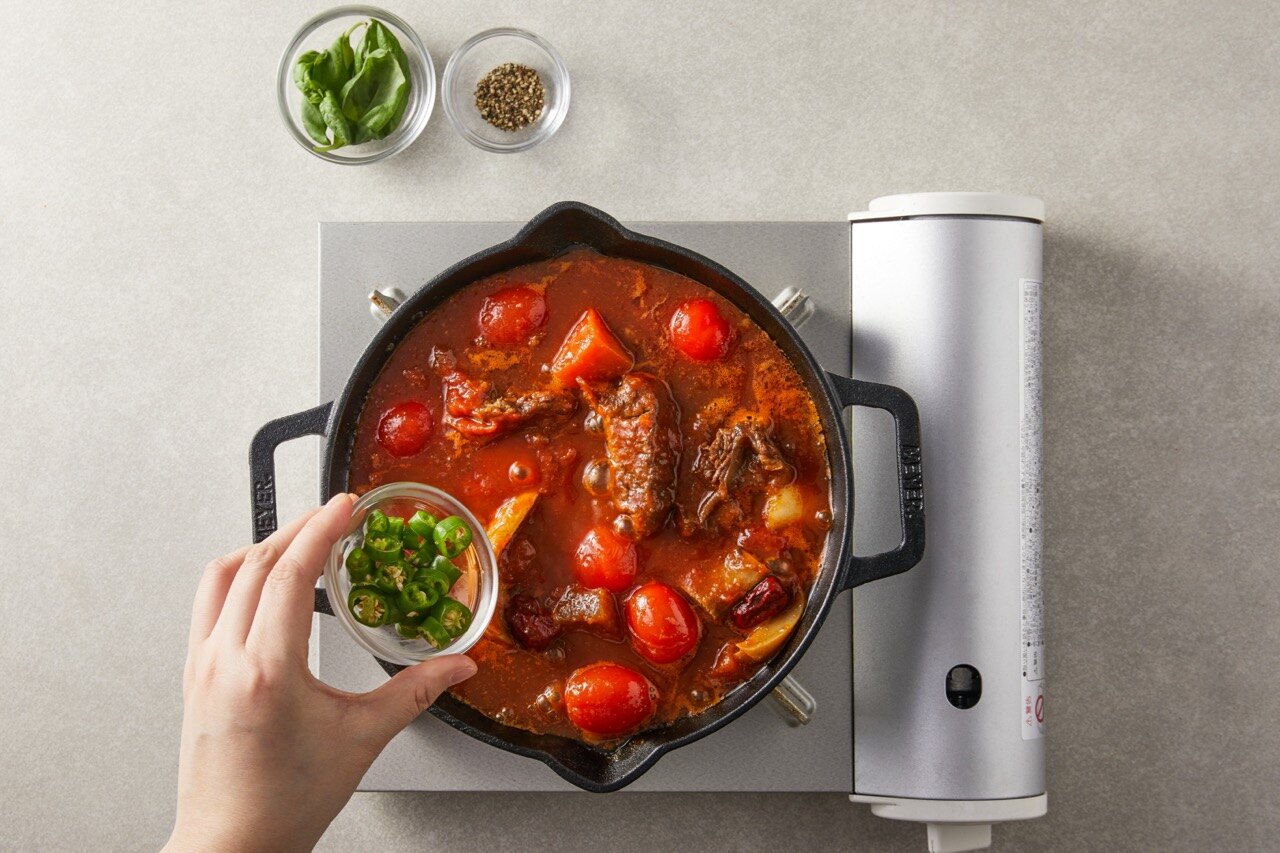 갈비찜의 색다른 변신! 달달한 갈비찜에 매콤함이 더해져 감칠맛이 폭발하는 매운 갈비찜 스튜로 즐겨보세요. 송송 썰어 넣은 청양고추와 새콤한 토마토소스, 향긋한 바질 잎까지 온 가족 입맛을 만족시킬 퓨전 요리입니다.