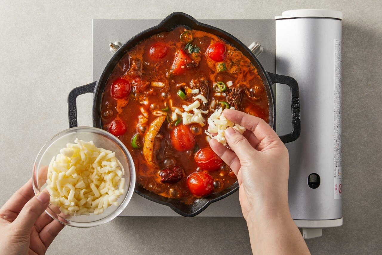 피자치즈를 올리고 잔열로 녹여준 후 마무리합니다.
