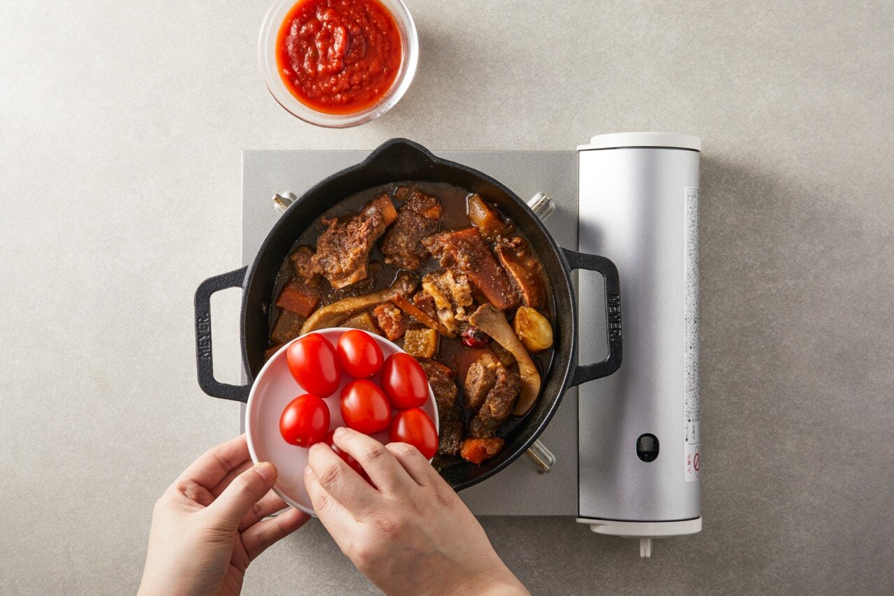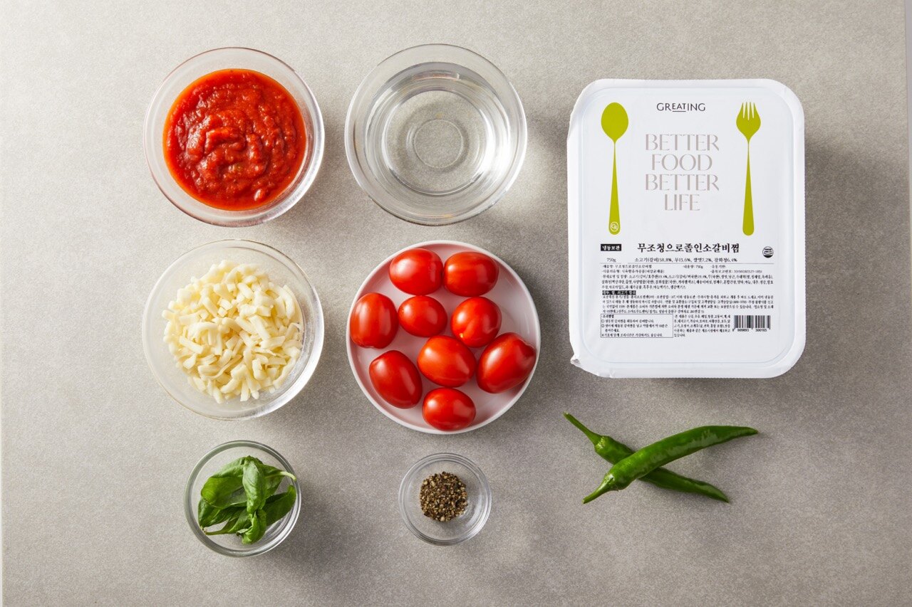 갈비찜에 시판 토마토소스와 방울토마토를 넣고 10분 가량 푹 끓여주세요.