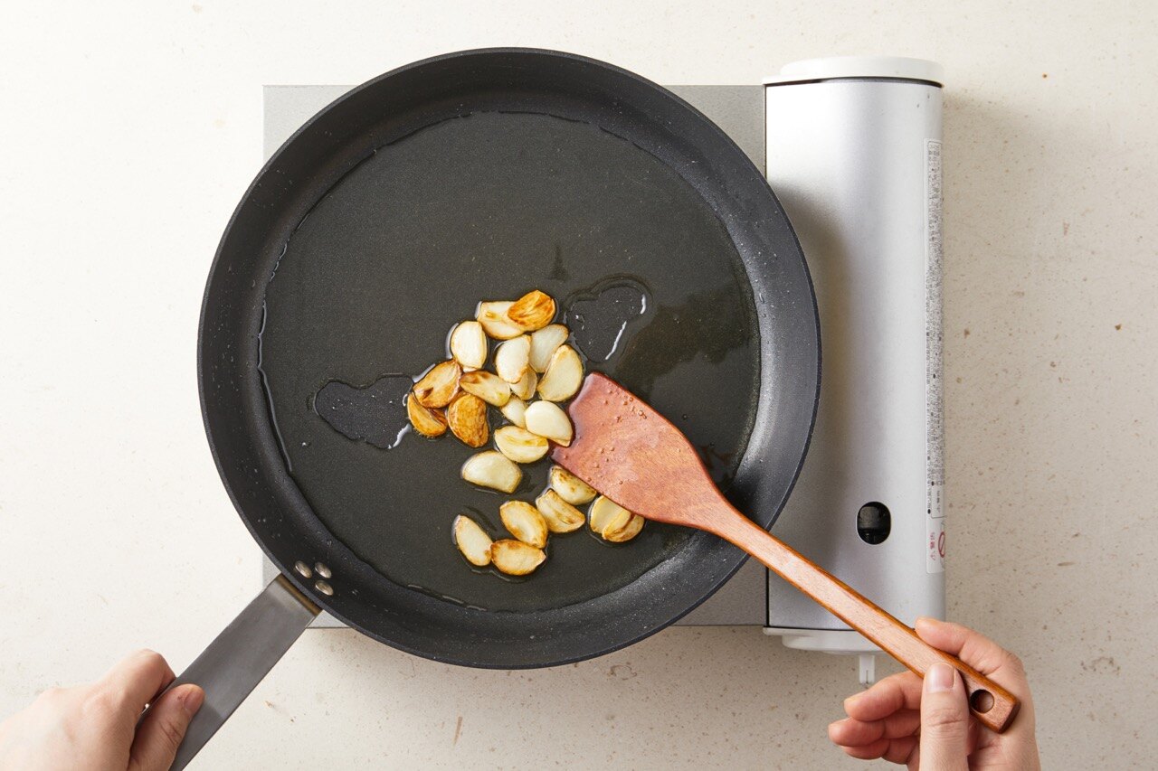 올리브유를 두른 팬에 편마늘을 볶아 향을 내어 주세요.