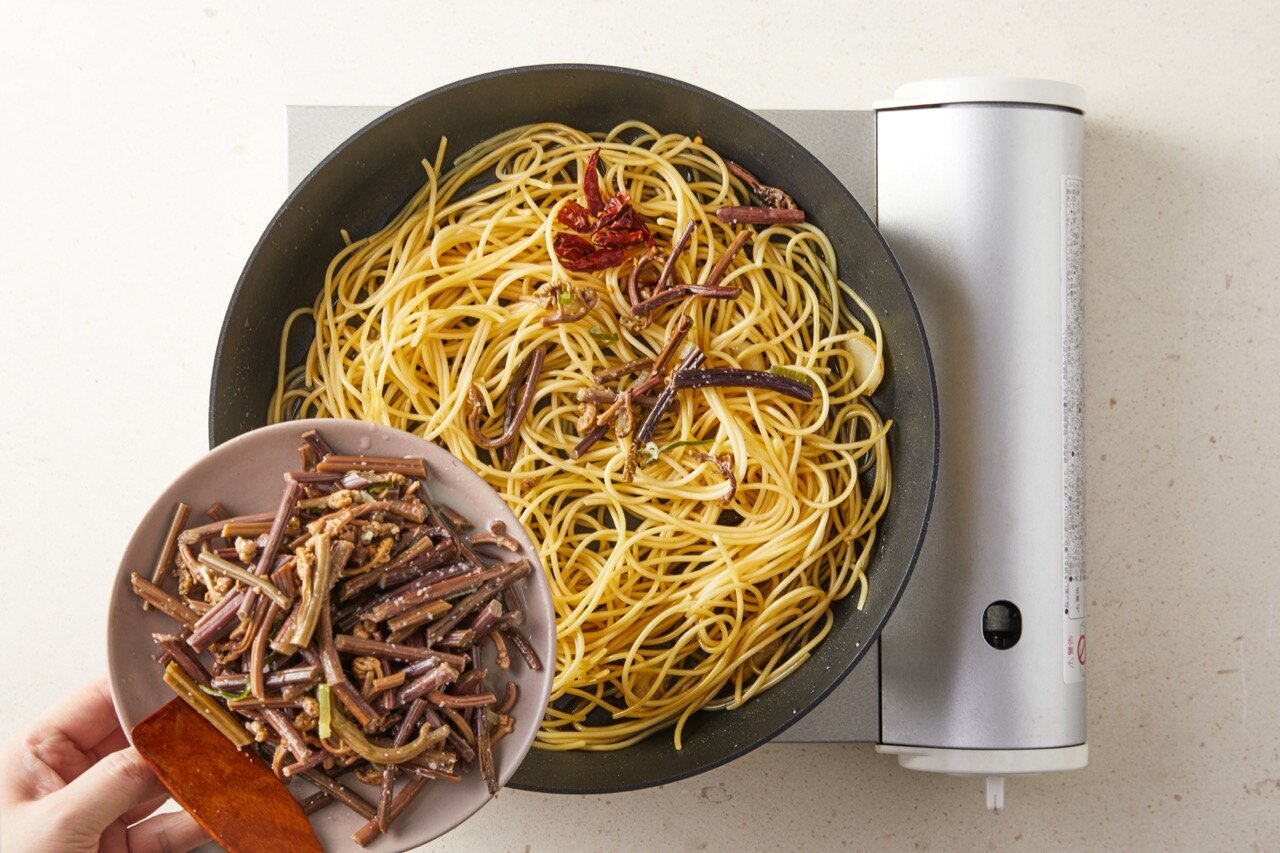 삶은 스파게티면과 고사리볶음, 페페론치노, 후추를 넣고 골고루 볶아주세요.