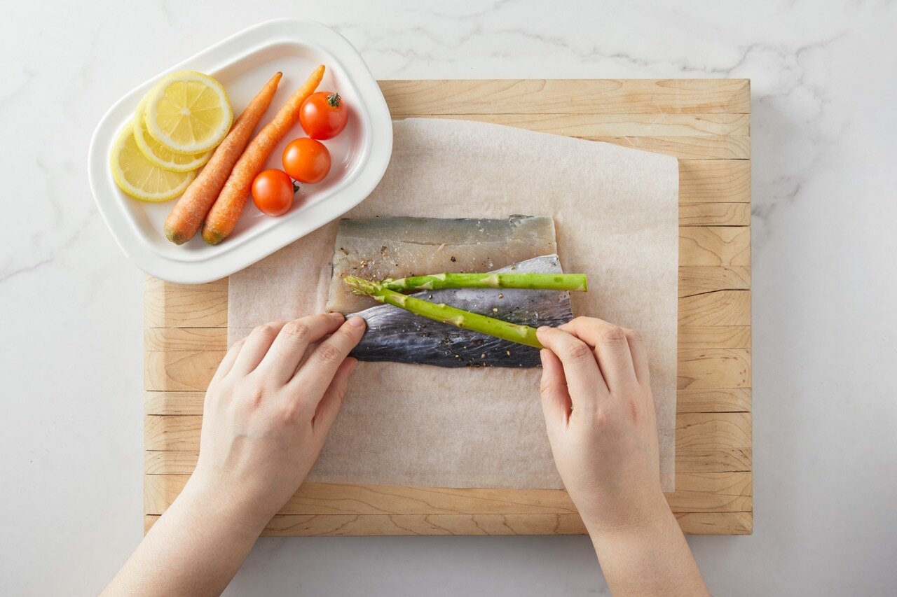 종이호일 위에 밑간을 해둔 삼치와 아스파라거스,