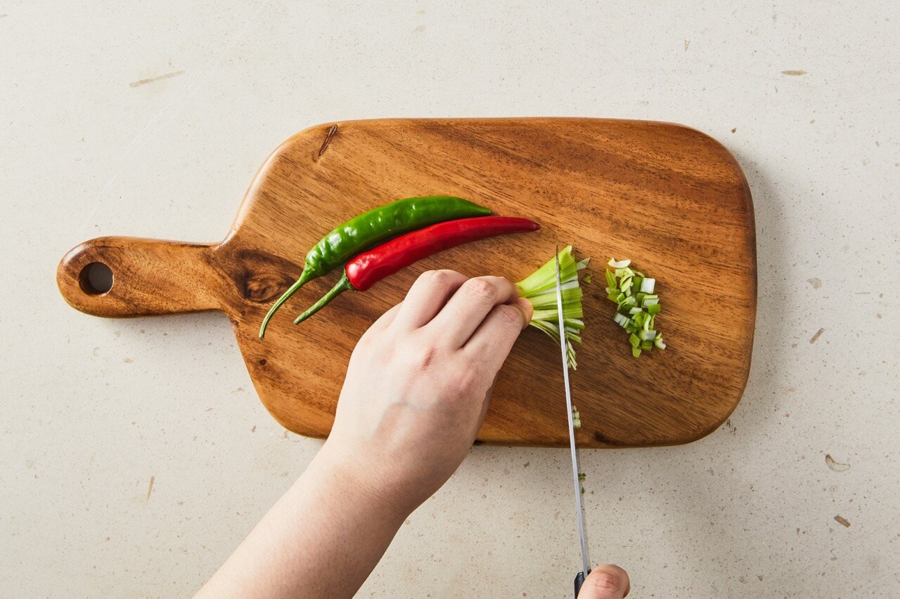 양념장이 들어갈 대파와 청홍고추를 잘게 다져 준비합니다.
