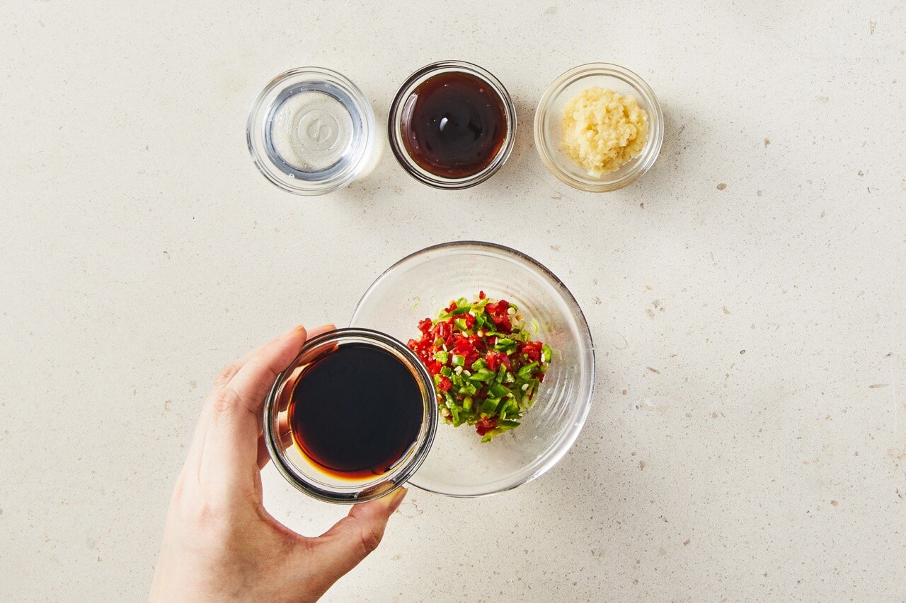 간장, 굴소스, 마늘, 올리고당과 손질해놓은 채소들을 섞어 양념장을 만들어 주세요.