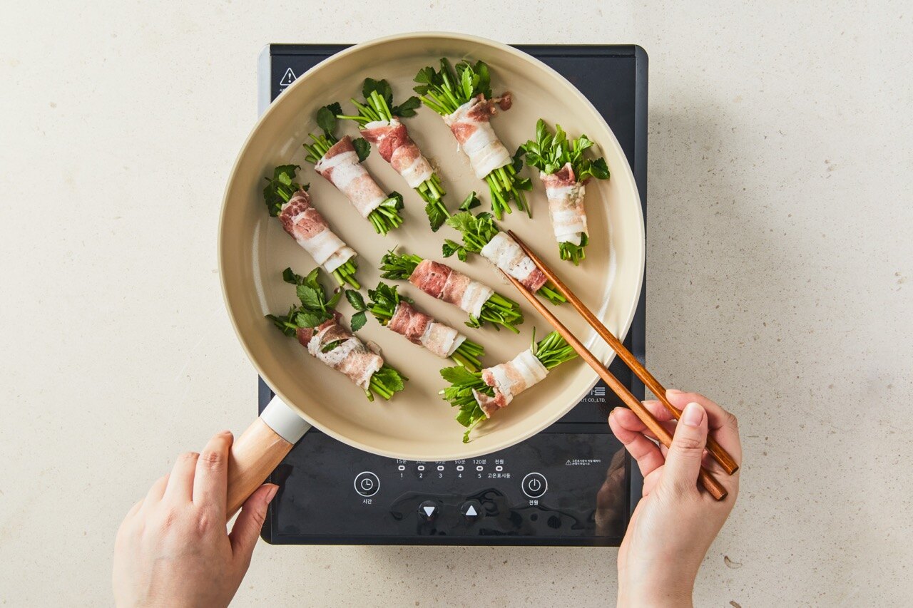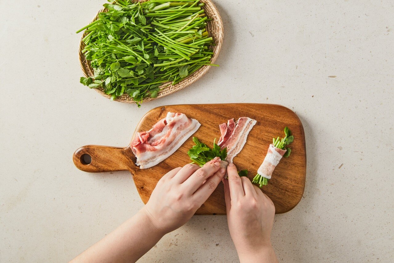 대패삼겹살을 넓게 펼친 후, 미나리를 적당량 올려 찢어지지 않을 정도로 단단하게 말아주세요.