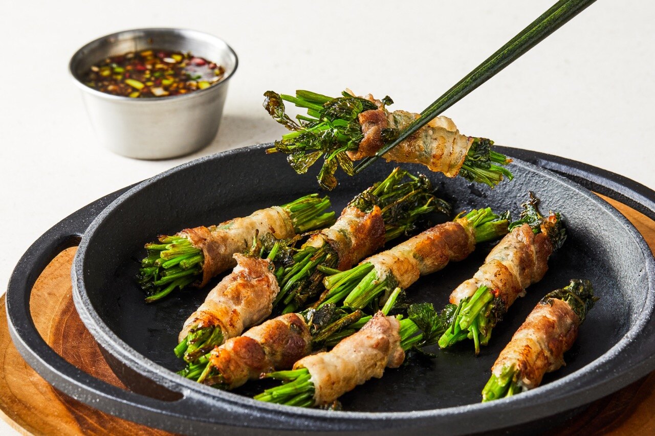 노릇하게 구워진 미나리 대패삼겹말이에 양념장을 곁들여 드세요.