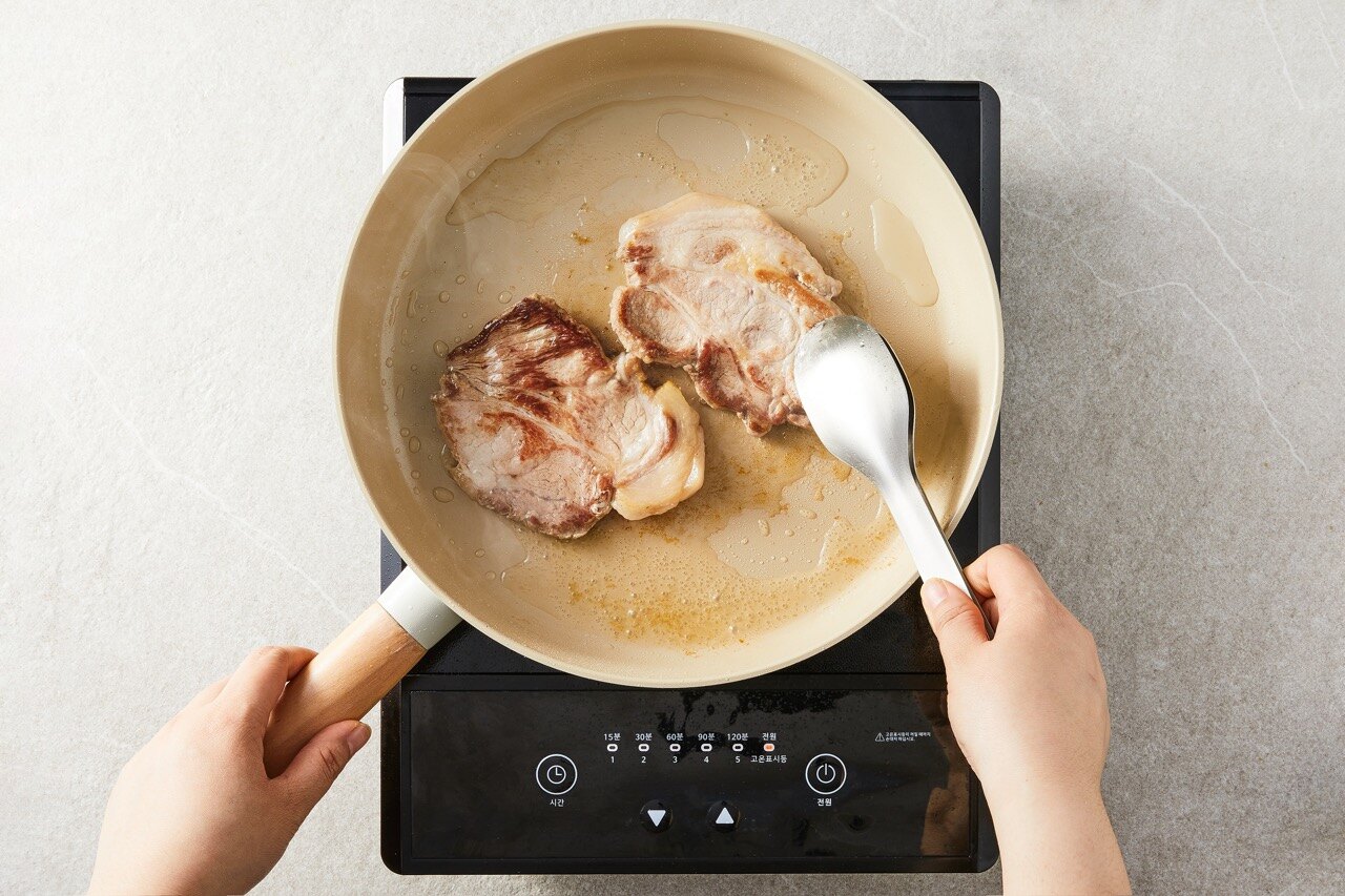 소금, 후추로 간을 한 목살을 앞뒤로 노릇하게 구워주세요.