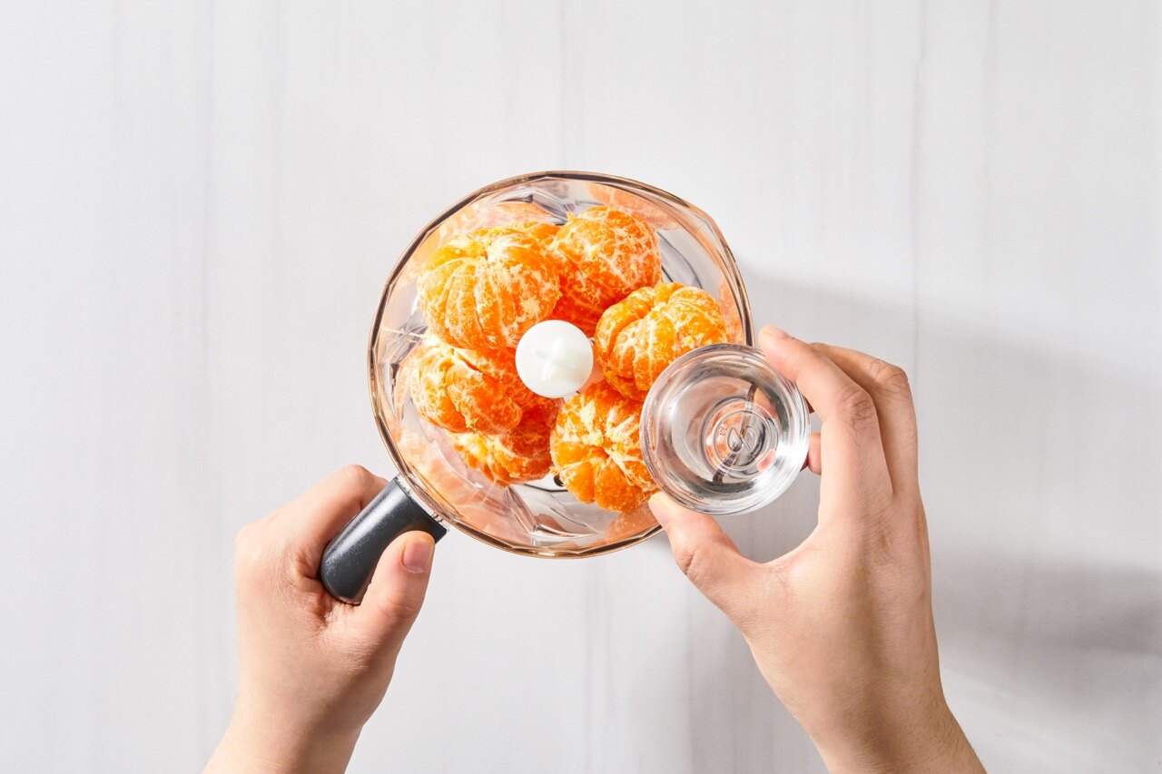 블렌더에 껍질을 깐 귤과 올리고당을 넣고 곱게 갈아주세요.