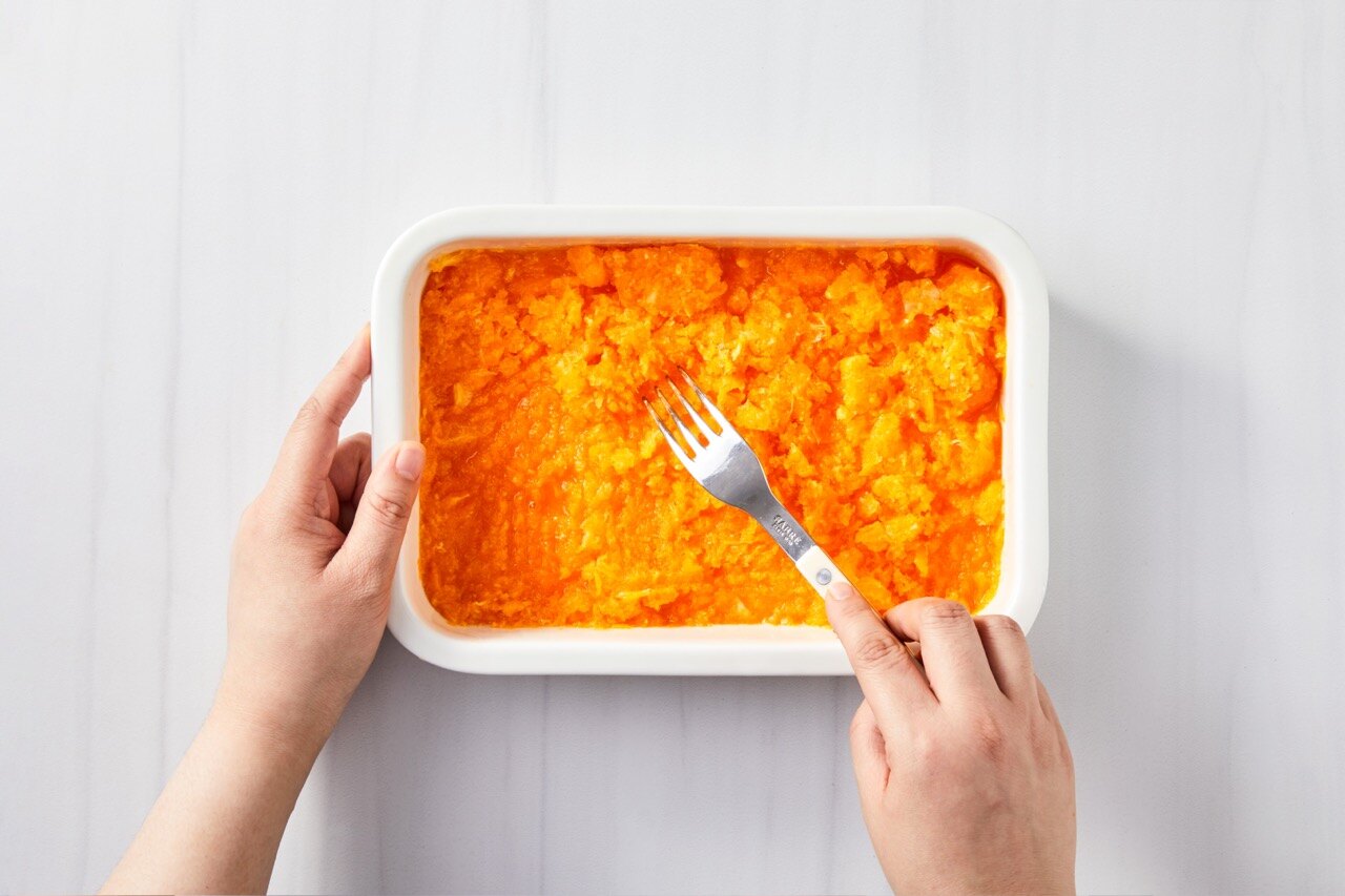 5시간이 지나면 포크로 긁어내며 입자를 부드럽게 만든 후 다시 5시간 냉동보관해 주세요.