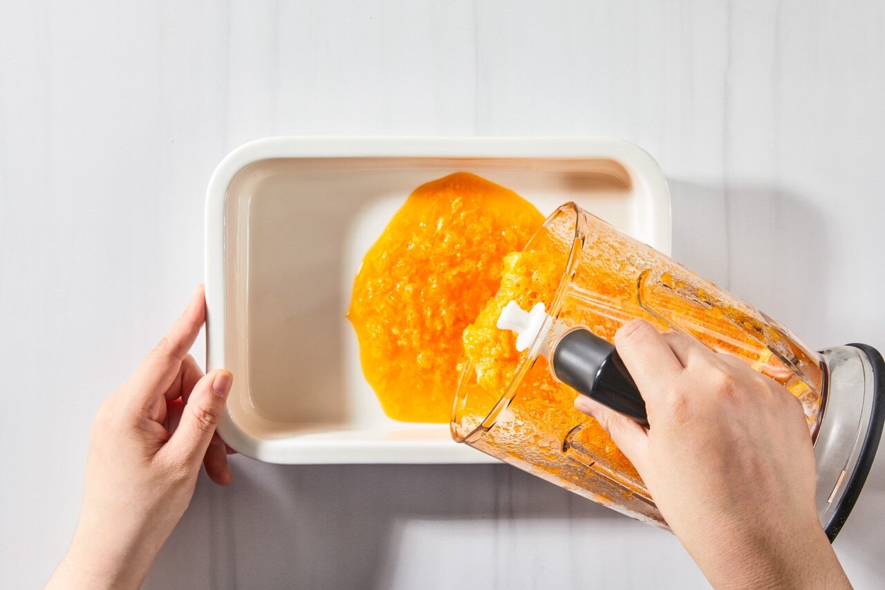 평평하고 넓은 그릇에 내용물을 붓고, 랩으로 덮어 냉동실에서 5시간 얼려줍니다.