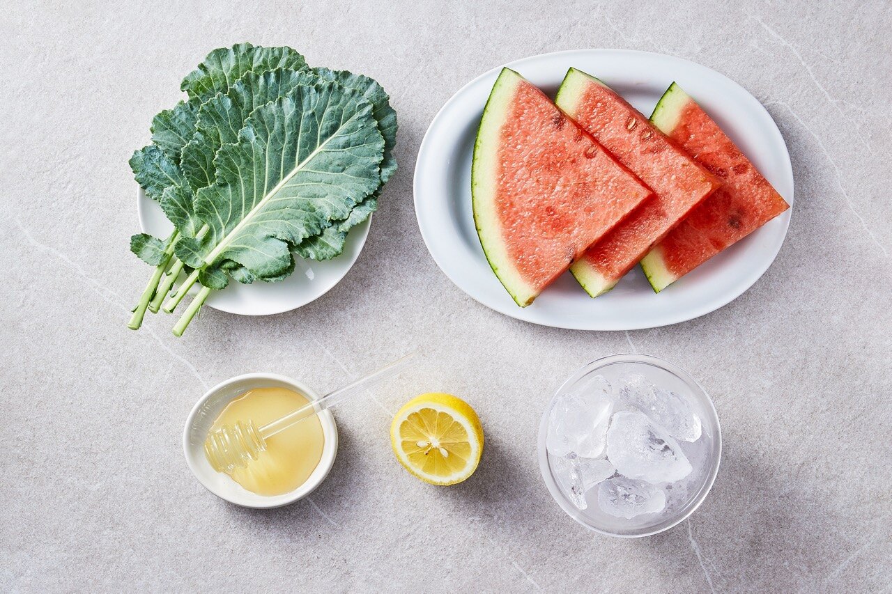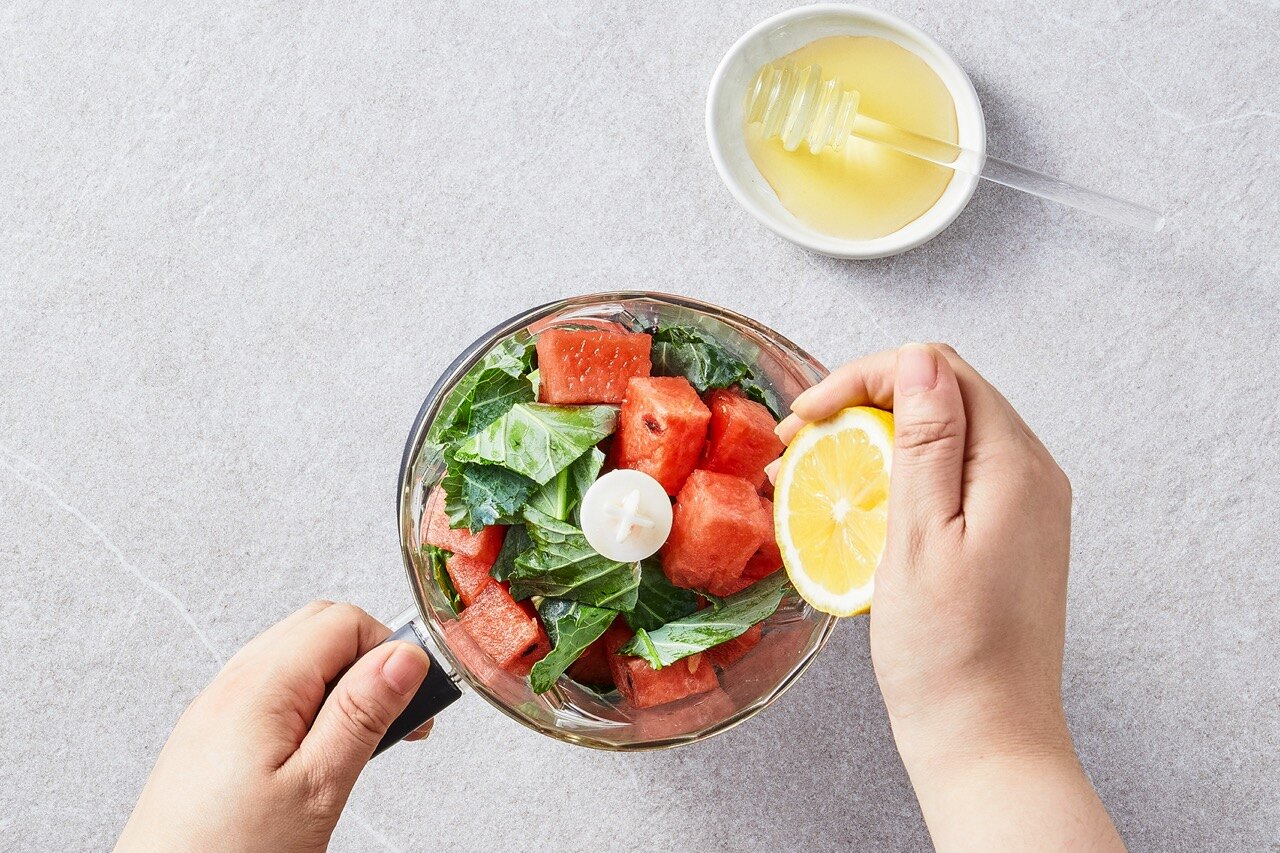 블렌더에 수박, 케일, 레몬즙, 꿀, 얼음을 넣고 갈아주세요.
