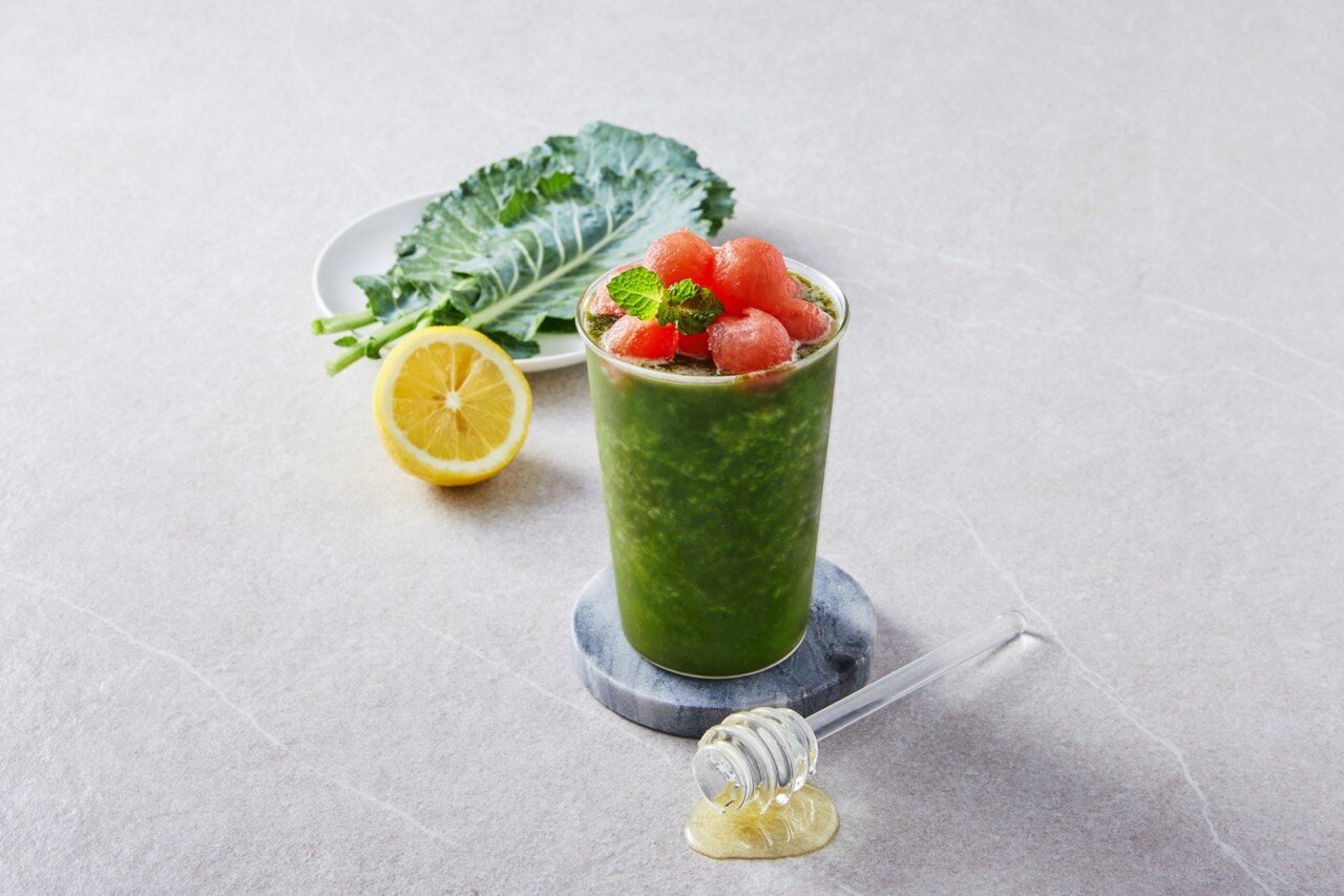 여름 대표 과일인 수박과 같이 먹으면 좋은 페어링 식재료, 케일을 넣은 클린 주스입니다. 수박에 풍부한 라이코펜은 지용성 성분으로 오메가3와 같은 지방질과 함께 섭취하면 체내 흡수율이 증가해요. 항산화 효과를 높여줄 레몬까지 첨가하면 더욱 좋아요!