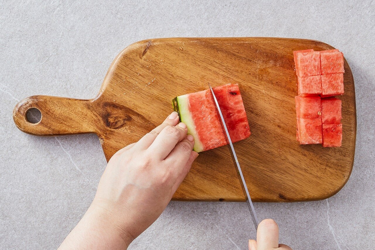 수박은 껍질 부분을 제거하고 깍둑썰어 준비합니다.