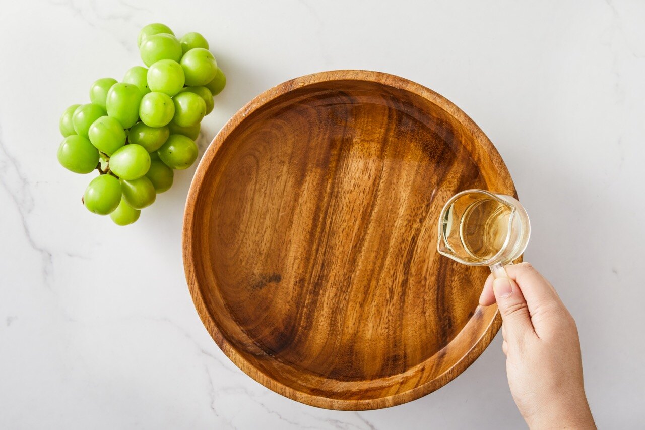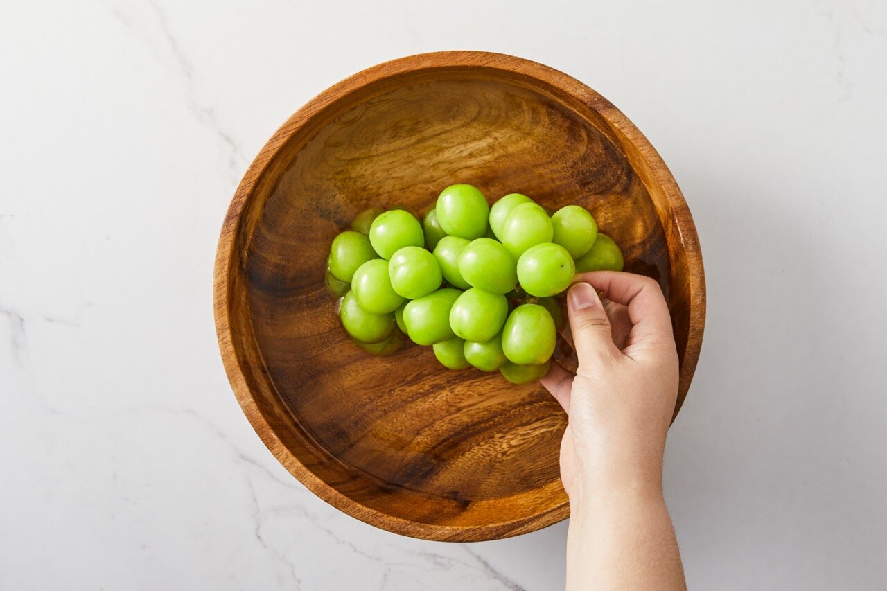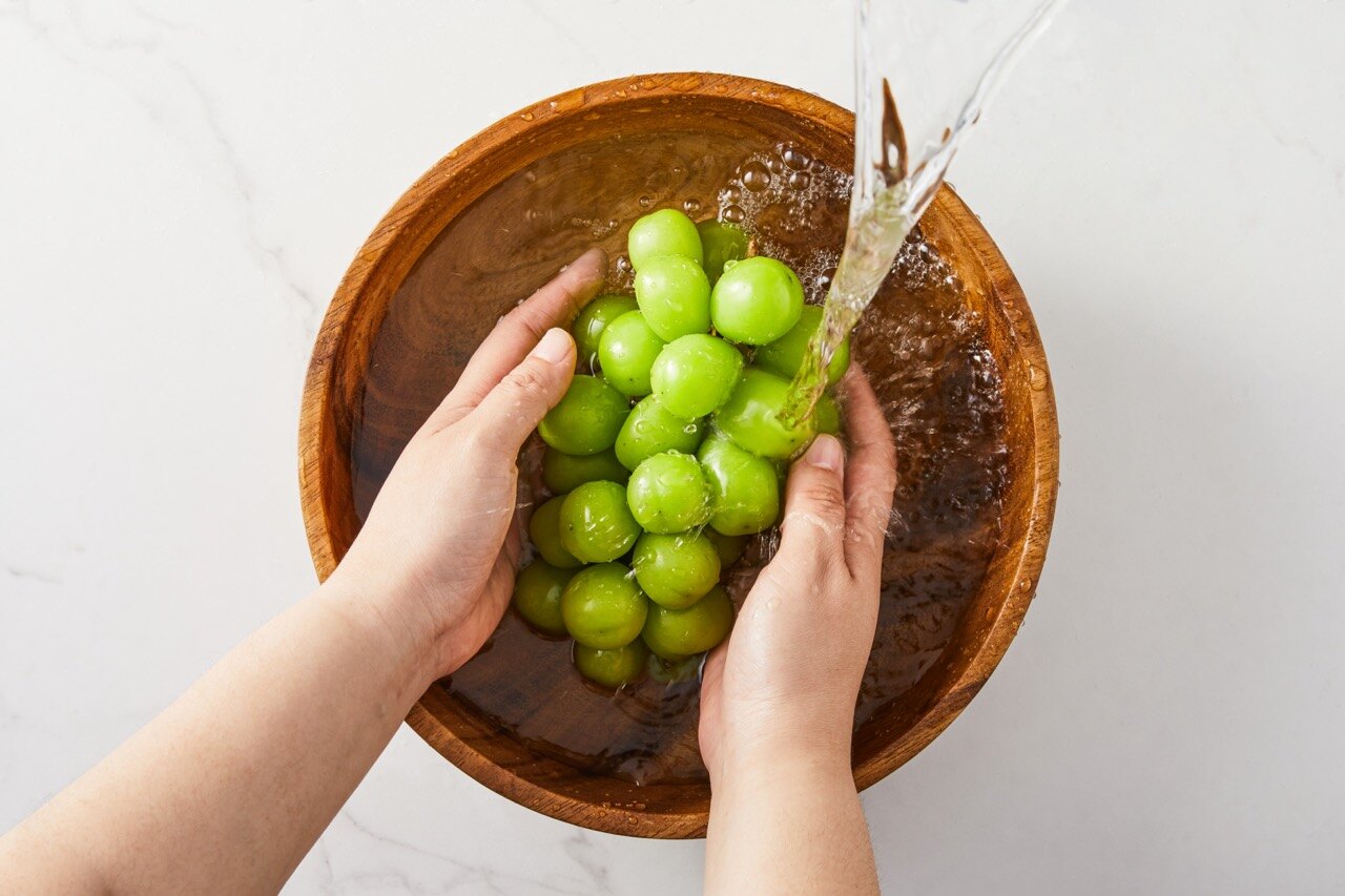 식초를 약간 푼 물에 샤인머스캣을 송이째 1-2분 정도 담근 후 헹궈주세요.
