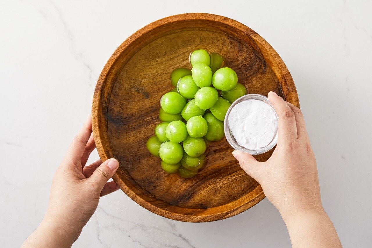 샤인머스캣을 물에 담가놓고 표면에 베이킹소다를 뿌린 후 흐르는 물에 여러번 씻어 주세요.