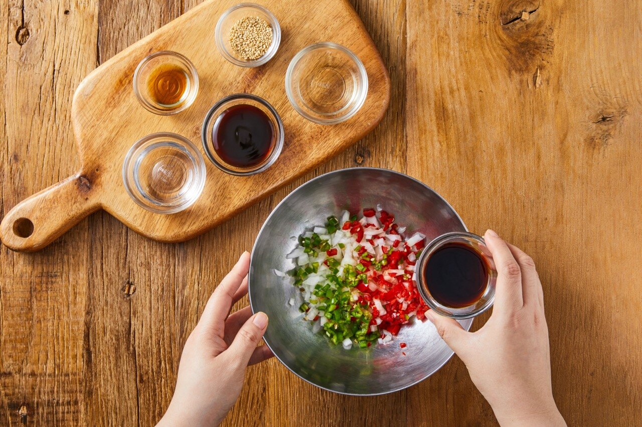다진 채소에 간장, 굴소스, 올리고당, 식초, 참기름, 참깨를 골고루 섞어 양념장을 만듭니다.